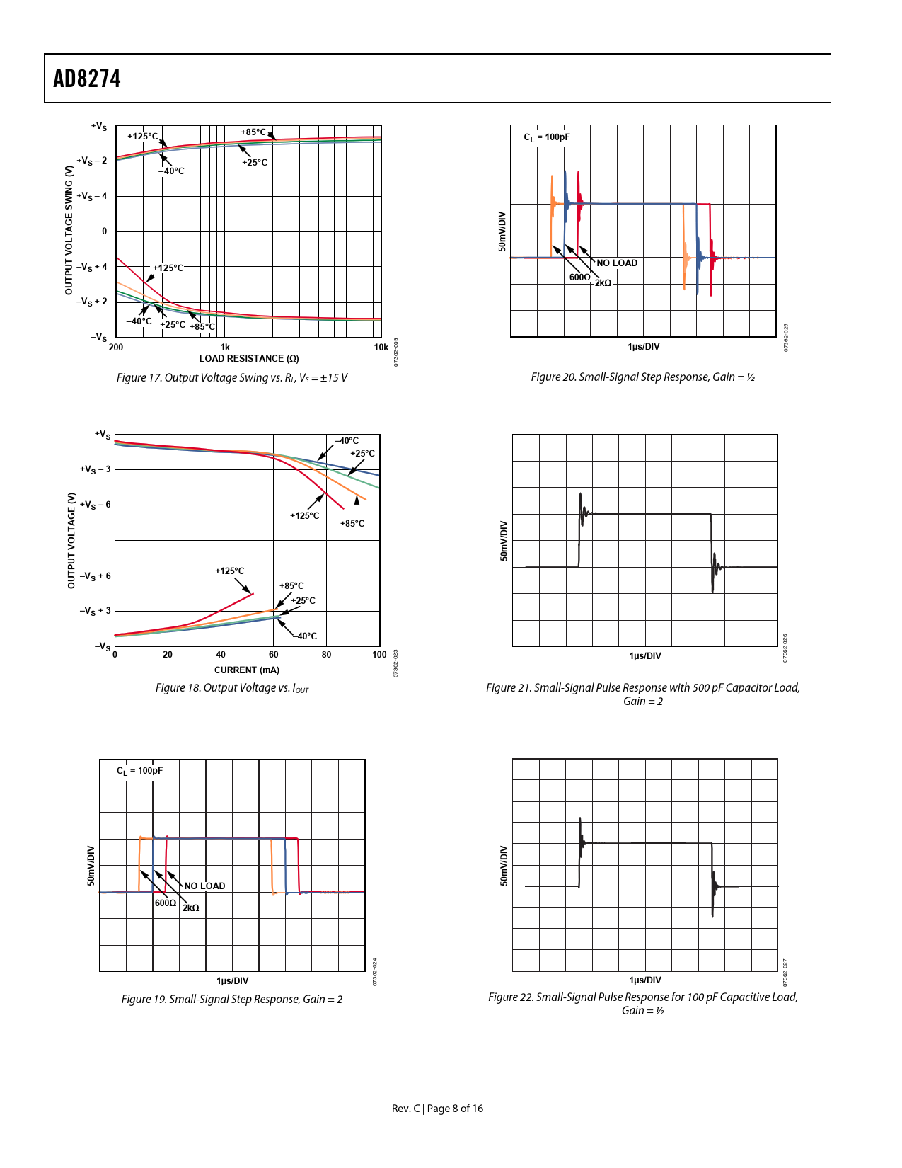 AD8274. +VS. +85°C. +125°C. CL = 100pF. +VS – 2. +25°C. –40°C. ( G IN +VS – 4. W S E. G A. /DI. LT O. 50mV. V T U –V. NO LOAD. S + 4. 600Ω. 2kΩ. O –VS+ 2