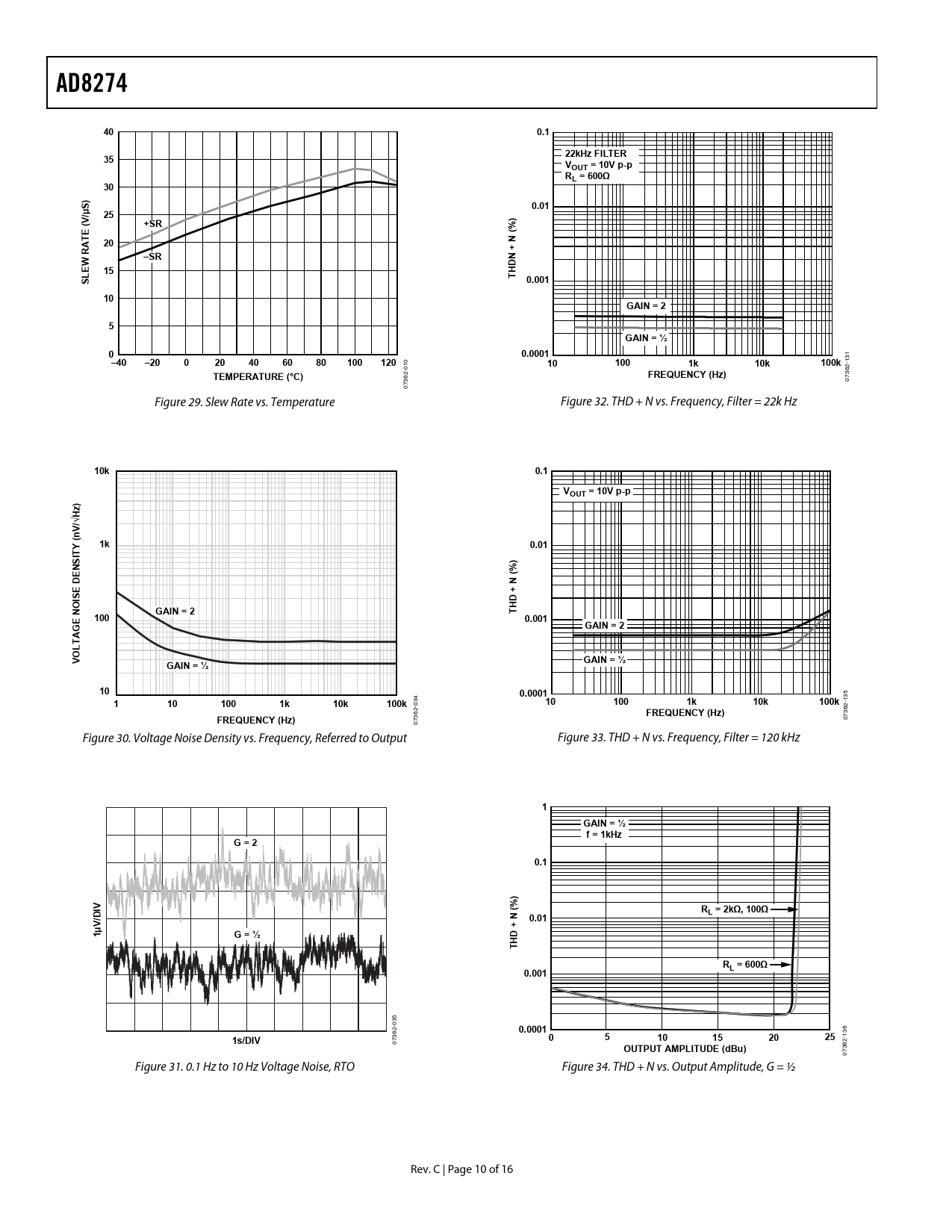 AD8274400.122kHz FILTER35VOUT = 10V p-pRL = 600Ω30S)0.01/µ25)(V+SR%E(T A20N +–SRDNEW R15HLTS0.00110GAIN = 25GAIN = ½00.0001 31 –40–20020406080100120 1 10 101001k10k100k 2- -0 TEMPERATURE (°C) 36 62 FREQUENCY (Hz) 07 73 0 Figure 29. Slew Rate vs. Temperature Figure 32. THD + N vs. Frequency, Filter = 22k Hz 10k0.1VOUT = 10V p-p)/√Hz V n ( Y1k0.01IT)NS%E DN (E ISD + HNOGAIN = 2TE1000.001GAIN = 2AG T L O VGAIN = ½GAIN = ½100.0001 4 35 1101001k10k100k 3 1 0 101001k10k100k 2- 2- FREQUENCY (Hz) 36 FREQUENCY (Hz) 36 07 07 Figure 30. Voltage Noise Density vs. Frequency, Referred to Output Figure 33. THD + N vs. Frequency, Filter = 120 kHz 1GAIN = ½f = 1kHzG = 20.1)IV%R/DL = 2kΩ, 100ΩN (0.01V 1µG = ½HD + TRL = 600Ω0.001 35 0 2- 0.0001 6 1s/DIV 36 0510152025 -13 07 62 OUTPUT AMPLITUDE (dBu) 73 0 Figure 31. 0.1 Hz to 10 Hz Voltage Noise, RTO Figure 34. THD + N vs. Output Amplitude, G = ½ Rev. C | Page 10 of 16 Document Outline FEATURES APPLICATIONS GENERAL DESCRIPTION FUNCTIONAL BLOCK DIAGRAM TABLE OF CONTENTS REVISION HISTORY SPECIFICATIONS ABSOLUTE MAXIMUM RATINGS THERMAL RESISTANCE MAXIMUM POWER DISSIPATION SHORT-CIRCUIT CURRENT ESD CAUTION PIN CONFIGURATIONS AND FUNCTION DESCRIPTION TYPICAL PERFORMANCE CHARACTERISTICS THEORY OF OPERATION CIRCUIT INFORMATION DC Performance AC Performance Production Costs Size DRIVING THE AD8274 POWER SUPPLIES INPUT VOLTAGE RANGE CONFIGURATIONS DRIVING CABLING OUTLINE DIMENSIONS ORDERING GUIDE