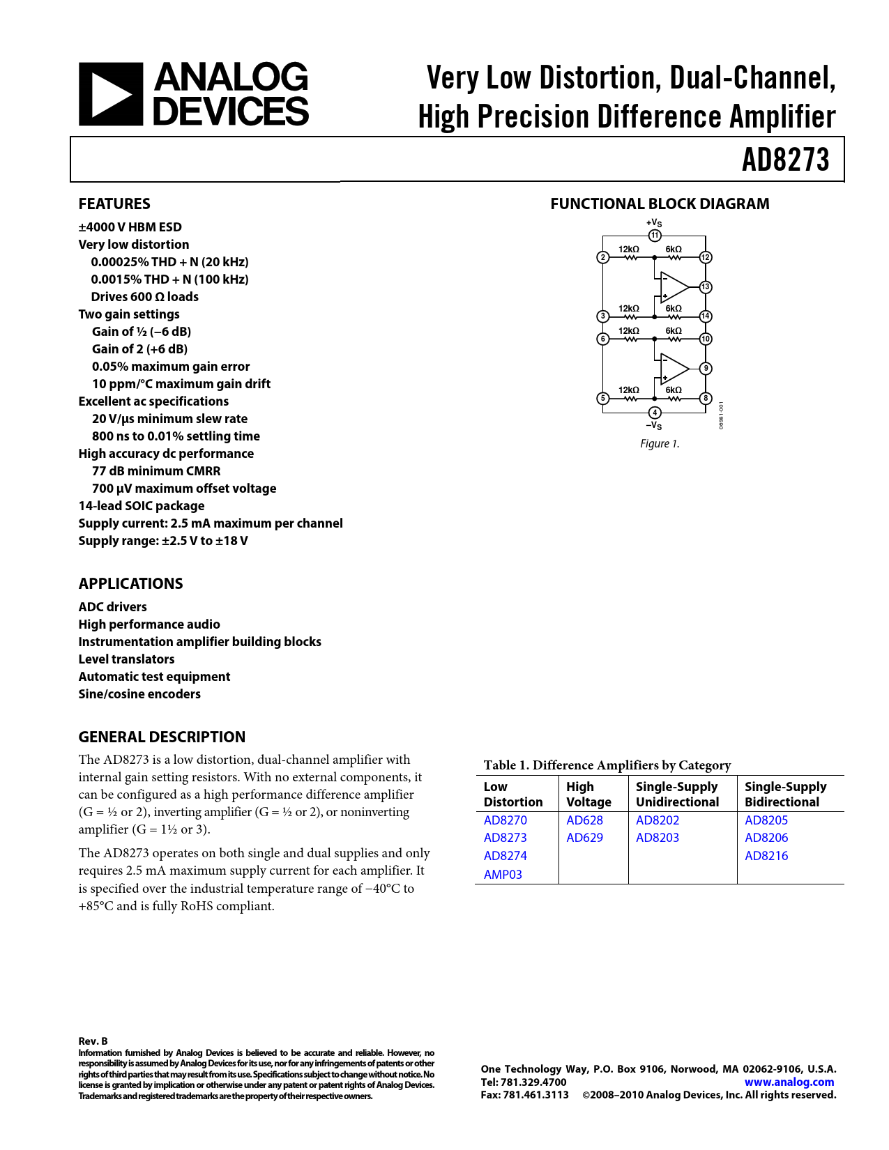 Very Low Distortion, Dual-Channel,. High Precision Difference Amplifier. AD8273. FEATURES. FUNCTIONAL BLOCK DIAGRAM