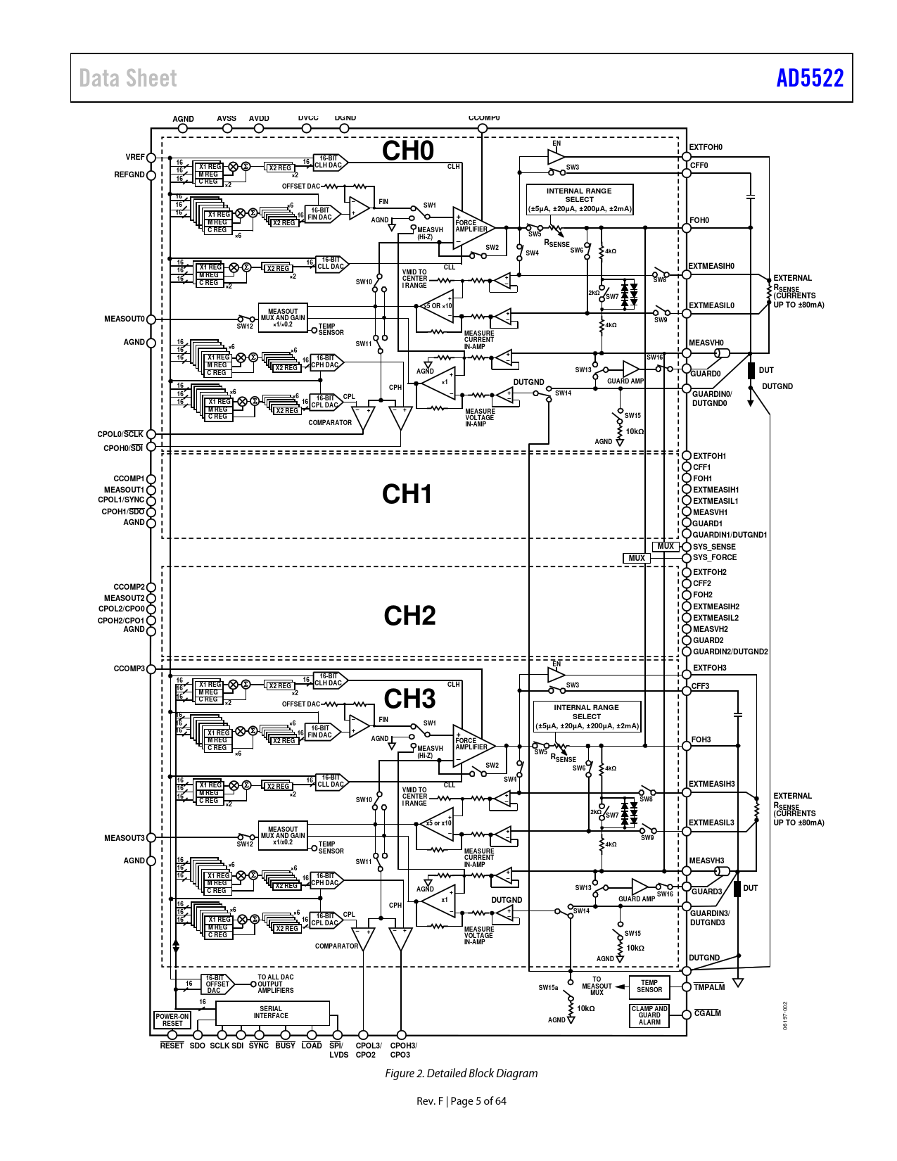 Data Sheet AD5522 AGND AVSS AVDD DVCC DGND CCOMP0 EN VREF 16-BIT 16 16 CH0 EXTFOH0 X1 REG CLH DAC CLH CFF0 X2 REG SW3 16 M REG REFGND ×2 16 C REG ×2 OFFSET DAC INTERNAL RANGE 16 FIN SELECT 16 ×6 SW1 (±5µA, ±20µA, ±200µA, ±2mA) 16 16-BIT X1 REG + 16 FIN DAC + M REG AGND FOH0 X2 REG FORCE C REG MEASVH AMPLIFIER SW5 ×6 (Hi-Z) RSENSE SW2 SW4 SW6 4kΩ 16 16 16-BIT X1 REG CLL DAC CLL EXTMEASIH0 16 X2 REG VMID TO M REG ×2 + 16 CENTER EXTERNAL C REG SW8 SW10 ×2 I RANGE RSENSE 2kΩ SW7 (CURRENTS + ×5 OR ×10 EXTMEASIL0 UP TO ±80mA) MEASOUT + MEASOUT0 MUX AND GAIN SW9 ×1/×0.2 SW12 TEMP 4kΩ SENSOR MEASURE AGND 16 CURRENT SW11 MEASVH0 ×6 IN-AMP 16 ×6 + 16 X1 REG SW16 16 16-BIT M REG CPH DAC X2 REG AGND SW13 DUT C REG + GUARD0 ×1 GUARD AMP DUTGND 16 CPH DUTGND 16 ×6 + SW14 ×6 GUARDIN0/ CPL 16-BIT 16 X1 REG 16 DUTGND0 CPL DAC M REG X2 REG + + MEASURE C REG VOLTAGE SW15 COMPARATOR IN-AMP CPOL0/SCLK 10kΩ AGND CPOH0/SDI EXTFOH1 CFF1 CCOMP1 FOH1 MEASOUT1 CH1 EXTMEASIH1 CPOL1/SYNC EXTMEASIL1 CPOH1/SDO MEASVH1 AGND GUARD1 GUARDIN1/DUTGND1 MUX SYS_SENSE MUX SYS_FORCE EXTFOH2 CFF2 CCOMP2 FOH2 MEASOUT2 CPOL2/CPO0 EXTMEASIH2 CPOH2/CPO1 CH2 EXTMEASIL2 AGND MEASVH2 GUARD2 GUARDIN2/DUTGND2 EN CCOMP3 EXTFOH3 16-BIT 16 16 X1 REG CLH DAC CLH X2 REG SW3 CFF3 16 M REG ×2 16 C REG ×2 OFFSET DAC CH3 INTERNAL RANGE 16 SELECT FIN 16 ×6 SW1 (±5µA, ±20µA, ±200µA, ±2mA) 16 16-BIT + X1 REG 16 FIN DAC + M REG X2 REG AGND FORCE FOH3 C REG AMPLIFIER MEASVH SW5 ×6 (Hi-Z) RSENSE SW2 SW6 4kΩ 16 16 16-BIT SW4 X1 REG CLL DAC CLL EXTMEASIH3 16 X2 REG VMID TO M REG ×2 + 16 CENTER EXTERNAL C REG SW10 SW8 ×2 I RANGE RSENSE 2kΩ SW7 (CURRENTS + x5 or x10 EXTMEASIL3 UP TO ±80mA) MEASOUT + MEASOUT3 MUX AND GAIN SW9 x1/x0.2 SW12 TEMP 4kΩ SENSOR MEASURE 16 AGND CURRENT SW11 MEASVH3 ×6 IN-AMP 16 ×6 + 16 X1 REG 16 16-BIT M REG CPH DAC X2 REG AGND SW13 C REG + GUARD3 DUT SW16 x1 GUARD AMP DUTGND 16 CPH 16 ×6 + ×6 SW14 CPL GUARDIN3/ 16-BIT 16 X1 REG 16 CPL DAC DUTGND3 M REG X2 REG + + MEASURE C REG VOLTAGE SW15 IN-AMP COMPARATOR 10kΩ AGND DUTGND 16-BIT TO ALL DAC TO 16 OUTPUT TEMP OFFSET MEASOUT SW15a TMPALM AMPLIFIERS SENSOR DAC MUX 16 SERIAL 10kΩ CLAMP AND
