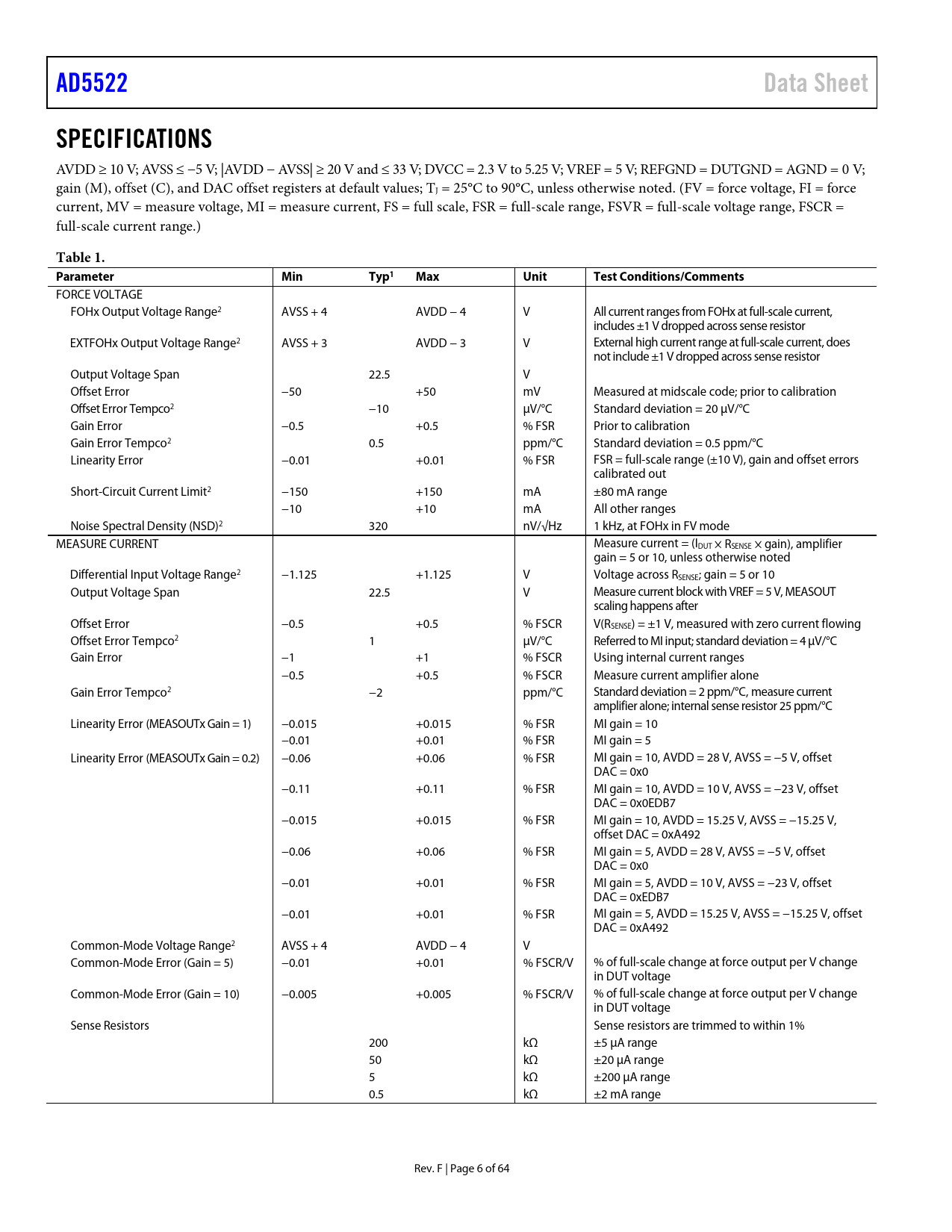 Pages / Page64 / 6 — AD5522. Data Sheet. SPECIFICATIONS. Table 1. Parameter. Min. Typ1. Max. …