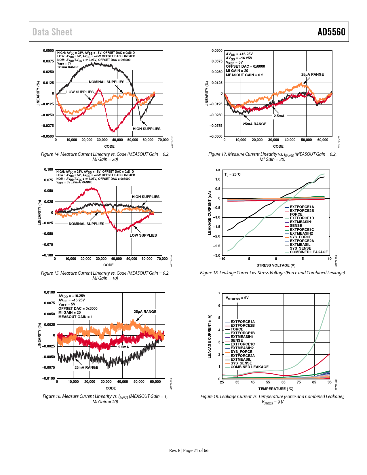 Data SheetAD55600.05000.0500HIGH: AVDD = 28V, AVSS = –5V, OFFSET DAC = 0xD1DAVLOW: AVDD = +16.25VDD = 5V, AVSS = –25V OFFSET DAC = 0xD4EBAVNOM: AVSS = –16.25VDD/AVSS = ±16.25V, OFFSET DAC = 0x80000.03750.0375VVREF = 5VREF = 5V±25mA RANGEOFFSET DAC = 0x80000.02500.0250MI GAIN = 20 MEASOUT GAIN = 0.225µA RANGENOMINAL SUPPLIES%)0.0125%)0.0125((YYTLOW SUPPLIEST00ARIARIINEINEL –0.0125L –0.0125–0.0250–0.02502.5mA–0.0375–0.037525mA RANGEHIGH SUPPLIES–0.0500–0.0500 037 010,00020,00030,00040,00050,00060,00070,000 040 010,00020,00030,00040,00050,00060,000CODE 07779- CODE 07779- Figure 14. Measure Current Linearity vs. Code (MEASOUT Gain = 0.2, Figure 17. Measure Current Linearity vs. IRANGE (MEASOUT Gain = 0.2, MI Gain = 20) MI Gain = 20) 0.1001.5HIGH: AVDD = 28V, AVSS = –5V, OFFSET DAC = 0xD1DLOW : AVTDD = 5V, AVSS = –25V OFFSET DAC = 0xD4EBJ = 25°CNOM : AVDD/AVSS = ±16.25V, OFFSET DAC = 0x80000.0751.0VREF = 5V ±25mA RANGE0.50.050A)HIGH SUPPLIESn (0%)0.025NT( Y–0.5EXTFORCE1ATEXTFORCE2B0ARIFORCECURRE E –1.0EXTFORCE1BINEEXTMEASIH1L –0.025NOMINAL SUPPLIES–1.5SENSEAKAGEXTFORCE1CE–0.050LEXTMEASIH2LOW SUPPLIES–2.0SYS_FORCE EXTFORCE2A–0.075–2.5EXTMEASIL SYS_SENSE COMBINED LEAKAGE–0.100–3.0 038 010,00020,00030,00040,00050,00060,00070,000 030 –1050510CODE 07779- STRESS VOLTAGE (V) 07779- Figure 15. Measure Current Linearity vs. Code (MEASOUT Gain = 0.2, Figure 18. Leakage Current vs. Stress Voltage (Force and Combined Leakage) MI Gain = 10) 0.01007AVDD = +16.25VVAVSTRESS = 9VSS = –16.25V0.0075VREF = 5V6OFFSET DAC = 0x800025µA RANGE0.0050MI GAIN = 20 MEASOUT GAIN = 1A)5n (EXTFORCE1A%)0.0025NTEXTFORCE2B( Y4FORCETEXTFORCE1B0EXTMEASIH1ARICURRESENSEE3INEEXTFORCE1CL –0.00252.5mAEXTMEASIH2AKAGSYS_FORCEE2–0.0050EXTFORCE2ALEXTMEASIL SYS_SENSE–0.007525mA RANGE1COMBINED LEAKAGE–0.01000 039 010,00020,00030,00040,00050,00060,000 031 2535455565758595CODE 07779- TEMPERATURE (°C) 07779- Figure 16. Measure Current Linearity vs. IRANGE (MEASOUT Gain = 1, Figure 19. Leakage Current vs. Temperature (Force and Combined Leakage), MI Gain = 20) VSTRESS = 9 V Rev. E | Page 21 of 66 Document Outline FEATURES APPLICATIONS GENERAL DESCRIPTION TABLE OF CONTENTS REVISION HISTORY FUNCTIONAL BLOCK DIAGRAM SPECIFICATIONS TIMING CHARACTERISTICS TIMING DIAGRAMS ABSOLUTE MAXIMUM RATINGS ESD CAUTION PIN CONFIGURATIONS AND FUNCTION DESCRIPTIONS TYPICAL PERFORMANCE CHARACTERISTICS TERMINOLOGY THEORY OF OPERATION FORCE AMPLIFIER HW_INH Function DAC REFERENCE VOLTAGE (VREF) OPEN-SENSE DETECT (OSD) ALARM AND CLAMP DEVICE UNDER TEST GROUND (DUTGND) DUTGND Kelvin Sense Kelvin Alarm (KELALM) GPO COMPARATORS CURRENT CLAMPS Clamp Alarm Function (CLALM) Clamp Enable Function (CLEN/LOAD) SHORT-CIRCUIT PROTECTION GUARD AMPLIFIER COMPENSATION CAPACITORS CURRENT RANGE SELECTION HIGH CURRENT RANGES Master and Slaves in Force Voltage (FV) Mode Master in FV Mode, Slaves in Force Current (FI) Mode IDEAL SEQUENCE FOR GANG MODE COMPENSATION FOR GANG MODE SYSTEM FORCE/SENSE SWITCHES DIE TEMPERATURE SENSOR AND THERMAL SHUTDOWN MEASURE OUTPUT (MEASOUT) VMID VOLTAGE FORCE AMPLIFIER STABILITY Safe Mode Autocompensation Mode Manual Compensation Mode POLES AND ZEROS IN A TYPICAL SYSTEM MINIMIZING THE NUMBER OF EXTERNAL COMPENSATION COMPONENTS CFx Pins CCx Pins EXTRA POLES AND ZEROS IN THE AD5560 The Effect of CCx The Effect of CFx The Effect of RZ The Effect of RP COMPENSATION STRATEGIES Ensuring Stability into an Unknown Capacitor Up to a Maximum Value OPTIMIZING PERFORMANCE FOR A KNOWN CAPACITOR USING AUTOCOMPENSATION MODE ADJUSTING THE AUTOCOMPENSATION MODE DEALING WITH PARALLEL LOAD CAPACITORS DAC LEVELS FORCE AND COMPARATOR DACS CLAMP DACS OSD DAC DUTGND DAC OFFSET DAC OFFSET AND GAIN REGISTERS Offset and Gain Registers for the Force Amplifier DAC Offset and Gain Registers for the Comparator DACs Offset and Gain Registers for the Clamp DACs REFERENCE SELECTION CALIBRATION Reducing Zero-Scale Error Reducing Gain Error Calibration Example ADDITIONAL CALIBRATION SYSTEM LEVEL CALIBRATION CHOOSING AVDD/AVSS POWER SUPPLY RAILS CHOOSING HCAVSSx AND HCAVDDx SUPPLY RAILS POWER DISSIPATION PACKAGE COMPOSITION AND MAXIMUM VERTICAL FORCE SLEW RATE CONTROL Programmable Slew Rate Ramp Function SERIAL INTERFACE SPI INTERFACE SPI WRITE MODE SDO OUTPUT FUNCTION BUSY FUNCTION LOAD FUNCTION REGISTER UPDATE RATES CONTROL REGISTERS DPS AND DAC ADDRESSING READBACK MODE DAC READBACK POWER-ON DEFAULT USING THE HCAVDDx AND HCAVSSx SUPPLIES POWER SUPPLY SEQUENCING REQUIRED EXTERNAL COMPONENTS POWER SUPPLY DECOUPLING APPLICATIONS INFORMATION THERMAL CONSIDERATIONS TEMPERATURE CONTOUR MAP ON THE TOP OF THE PACKAGE TQFP_EP Package BGA Package OUTLINE DIMENSIONS ORDERING GUIDE