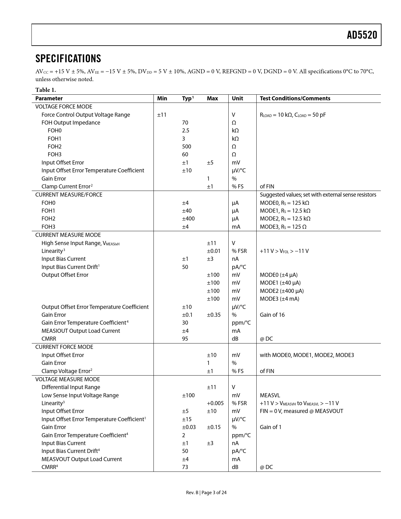 Pages / Page24 / 3 — AD5520. SPECIFICATIONS. Table 1. Parameter Min. Typ1. Max Unit Test. …