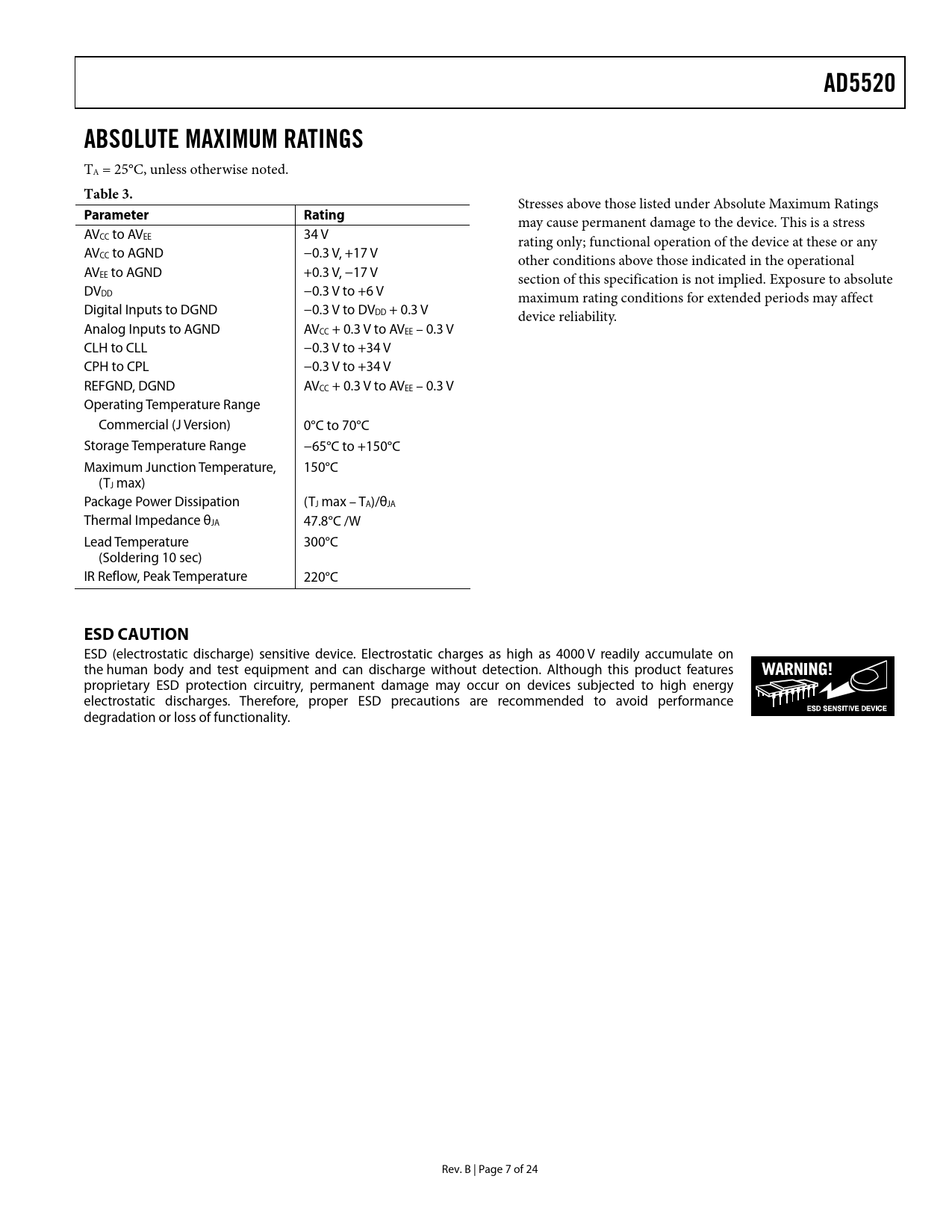 Pages / Page24 / 7 — AD5520. ABSOLUTE MAXIMUM RATINGS. Table 3. Parameter Rating. ESD CAUTION