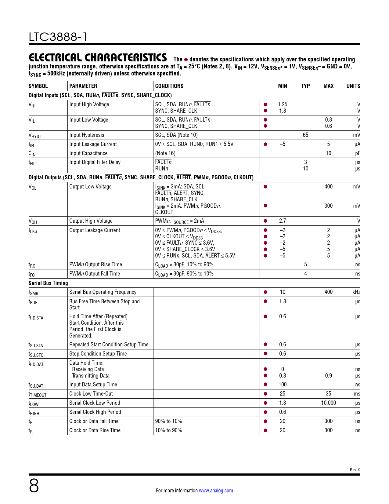 VOL Output Low Voltage ISINK = 3mA: SDA, SCL, l 400 mV FAULTn, ALERT, SYNC, RUNn, SHARE_CLK ISINK = 2mA: PWMn, PGOODn, l 300 mV CLKOUT VOH Output High Voltage PWMn, ISOURCE = 2mA l 2.7 V ILKG Output Leakage Current 0V ≤ PWMn, PGOODn ≤ VDD33, l –2 2 µA 0V ≤ CLKOUT ≤ VDD33 l –2 2 µA 0V ≤ FAULTn, SYNC ≤ 3.6V, l –2 2 µA 0V ≤ SHARE_CLOCK ≤ 3.6V l –5 5 µA 0V ≤ RUNn, SCL, SDA, ALERT ≤ 5.5V l –5 5 µA tRO PWMn Output Rise Time CLOAD = 30pF, 10% to 90% 5 ns tFO PWMn Output Fall Time CLOAD = 30pF, 90% to 10% 4 ns