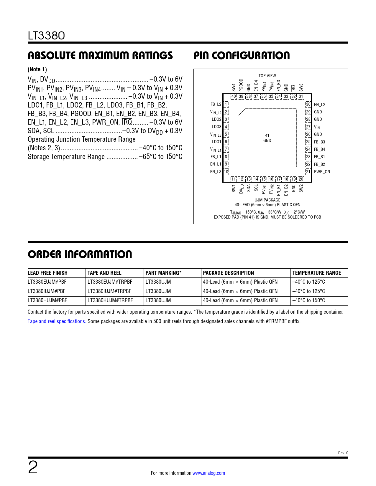 LT3380EUJM#PBF LT3380EUJM#TRPBF LT3380UJM 40-Lead (6mm 6mm) Plastic QFN –40°C to 125°C LT3380IUJM#PBF LT3380IUJM#TRPBF LT3380UJM 40-Lead (6mm 6mm) Plastic QFN –40°C to 125°C LT3380HUJM#PBF LT3380HUJM#TRPBF LT3380UJM 40-Lead (6mm 6mm) Plastic QFN –40°C to 150°C Contact the factory for parts specified with wider operating temperature ranges. *The temperature grade is identified by a label on the shipping container. Tape and reel specifications. Some packages are available in 500 unit reels through designated sales channels with #TRMPBF suffix. Rev. 0 2 For more information www.analog.com Document Outline Features Applications Typical Application Description Absolute Maximum Ratings Order Information Pin Configuration Electrical Characteristics Typical Performance Characteristics Pin Functions Block Diagram Operation Introduction Step-Down Switching Regulators Slewing DAC Reference Operation Power On Sequencing Power Off Sequencing Fault Detectionand Reporting I2C Operation Applications Information Thermal Considerations and Board Layout Typical Applications Package Description Typical Application Related Parts