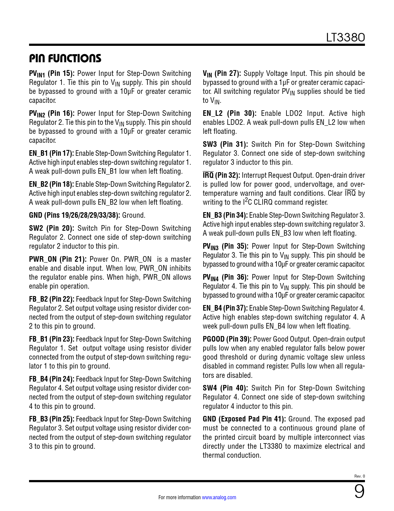 PIN FUNCTIONS PVIN1 (Pin 15):. VIN (Pin 27):. PVIN2 (Pin 16):. EN_L2 (Pin 30):. SW3 (Pin 31):. EN_B1 (Pin 17):. IRQ (Pin 32):