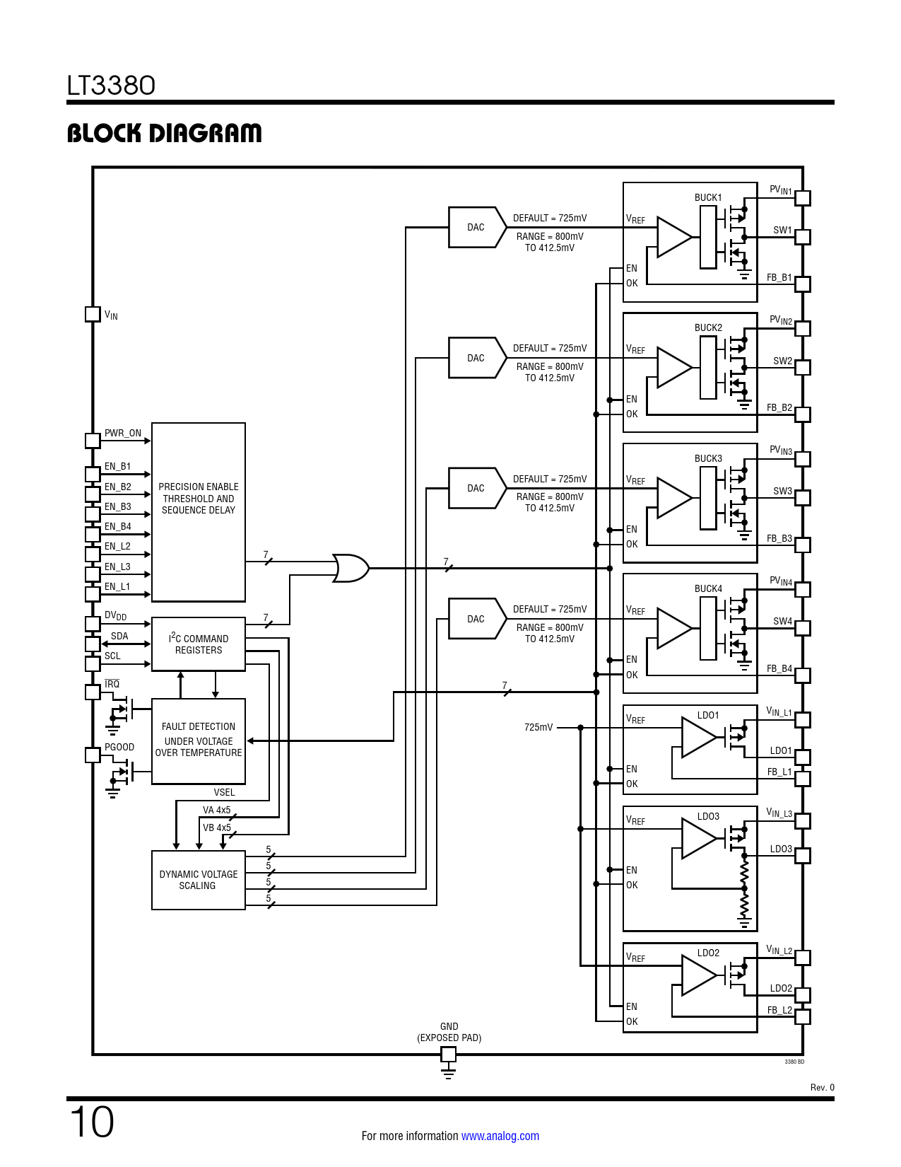 PV BUCK1 IN1 DEFAULT = 725mV VREF DAC RANGE = 800mV SW1 TO 412.5mV EN OK FB_B1 VIN PV BUCK2 IN2 DEFAULT = 725mV VREF DAC RANGE = 800mV SW2 TO 412.5mV EN OK FB_B2 PWR_ON PV BUCK3 IN3 EN_B1 DEFAULT = 725mV VREF EN_B2 PRECISION ENABLE DAC THRESHOLD AND RANGE = 800mV SW3 EN_B3 SEQUENCE DELAY TO 412.5mV EN_B4 EN EN_L2 OK FB_B3 7 EN_L3 7 PV EN_L1 BUCK4 IN4 DEFAULT = 725mV VREF DVDD 7 DAC RANGE = 800mV SW4 SDA I2C COMMAND TO 412.5mV REGISTERS SCL EN OK FB_B4 IRQ 7 LDO1 VIN_L1 VREF FAULT DETECTION 725mV UNDER VOLTAGE PGOOD OVER TEMPERATURE LDO1 EN FB_L1 OK VSEL VA 4x5 LDO3 VIN_L3 VREF VB 4x5 5 LDO3 5 EN DYNAMIC VOLTAGE 5 SCALING OK 5 LDO2 VIN_L2 VREF LDO2 EN FB_L2 OK GND (EXPOSED PAD) 3380 BD Rev. 0 10 For more information www.analog.com Document Outline Features Applications Typical Application Description Absolute Maximum Ratings Order Information Pin Configuration Electrical Characteristics Typical Performance Characteristics Pin Functions Block Diagram Operation Introduction Step-Down Switching Regulators Slewing DAC Reference Operation Power On Sequencing Power Off Sequencing Fault Detectionand Reporting I2C Operation Applications Information Thermal Considerations and Board Layout Typical Applications Package Description Typical Application Related Parts