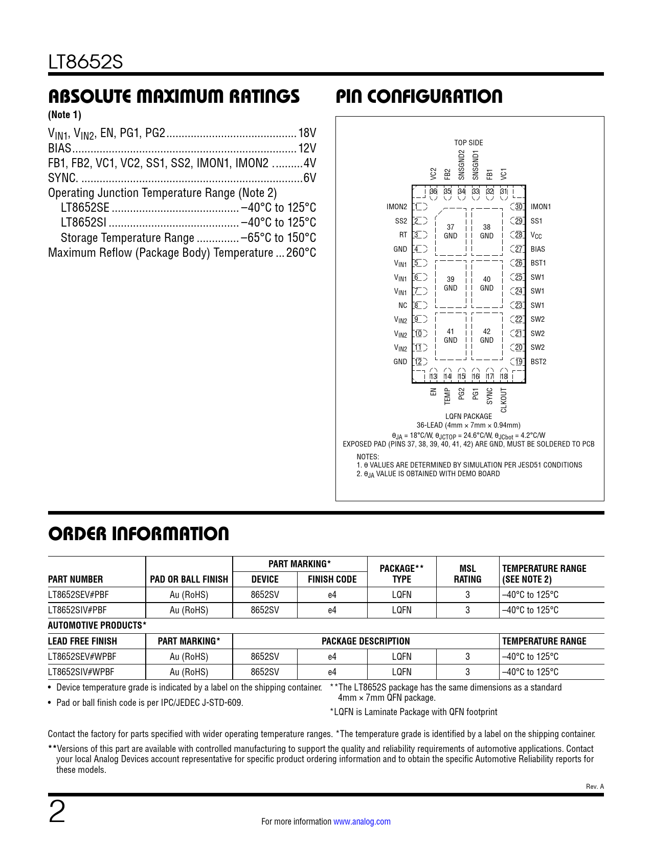 LT8652S ABSOLUTE MAXIMUM RATINGSPIN CONFIGURATION(Note 1) VIN1, VIN2, EN, PG1, PG2 ...18V BIAS ..12V TOP SIDE FB1, FB2, VC1, VC2, SS1, SS2, IMON1, IMON2 . ...4V SYNC. ...6V VC2 FB2 SNSGND2 SNSGND1 FB1 VC1 Operating Junction Temperature Range (Note 2) 36 35 34 33 32 31 LT8652SE .. –40°C to 125°C IMON2 1 30 IMON1 LT8652SI ... –40°C to 125°C SS2 2 29 SS1 37 38 Storage Temperature Range .. –65°C to 150°C RT 3 GND GND 28 VCC Maximum Reflow (Package Body) Temperature ...260°C GND 4 27 BIAS VIN1 5 26 BST1 VIN1 6 25 SW1 39 40 V GND GND IN1 7 24 SW1 NC 8 23 SW1 VIN2 9 22 SW2 VIN2 10 41 42 21 SW2 GND GND VIN2 11 20 SW2 GND 12 19 BST2 13 14 15 16 17 18 EN PG2 PG1 TEMP SYNC CLKOUT LQFN PACKAGE 36-LEAD (4mm × 7mm × 0.94mm) θJA = 18°C/W, θJCTOP = 24.6°C/W, θJCbot = 4.2°C/W EXPOSED PAD (PINS 37, 38, 39, 40, 41, 42) ARE GND, MUST BE SOLDERED TO PCB NOTES: 1. θ VALUES ARE DETERMINED BY SIMULATION PER JESD51 CONDITIONS 2. θJA VALUE IS OBTAINED WITH DEMO BOARD ORDER INFORMATIONPART MARKING*PACKAGE**MSLTEMPERATURE RANGEPART NUMBERPAD OR BALL FINISHDEVICEFINISH CODETYPERATING(SEE NOTE 2) LT8652SEV#PBF Au (RoHS) 8652SV e4 LQFN 3 –40°C to 125°C LT8652SIV#PBF Au (RoHS) 8652SV e4 LQFN 3 –40°C to 125°C AUTOMOTIVE PRODUCTS* LEAD FREE FINISHPART MARKING*PACKAGE DESCRIPTIONTEMPERATURE RANGE LT8652SEV#WPBF Au (RoHS) 8652SV e4 LQFN 3 –40°C to 125°C LT8652SIV#WPBF Au (RoHS) 8652SV e4 LQFN 3 –40°C to 125°C • Device temperature grade is indicated by a label on the shipping container. **The LT8652S package has the same dimensions as a standard • Pad or ball finish code is per IPC/JEDEC J-STD-609. 4mm × 7mm QFN package. *LQFN is Laminate Package with QFN footprint Contact the factory for parts specified with wider operating temperature ranges. *The temperature grade is identified by a label on the shipping container. ** Versions of this part are available with controlled manufacturing to support the quality and reliability requirements of automotive applications. Contact your local Analog Devices account representative for specific product ordering information and to obtain the specific Automotive Reliability reports for these models. Rev. A 2 For more information www.analog.com Document Outline Features Applications Typical Application Description Absolute Maximum Ratings Order Information Pin Configuration Electrical Characteristics Typical Performance Characteristics Pin Functions Block Diagram Operation Applications Information Typical Applications Package Description Revision History Typical Application Related Parts