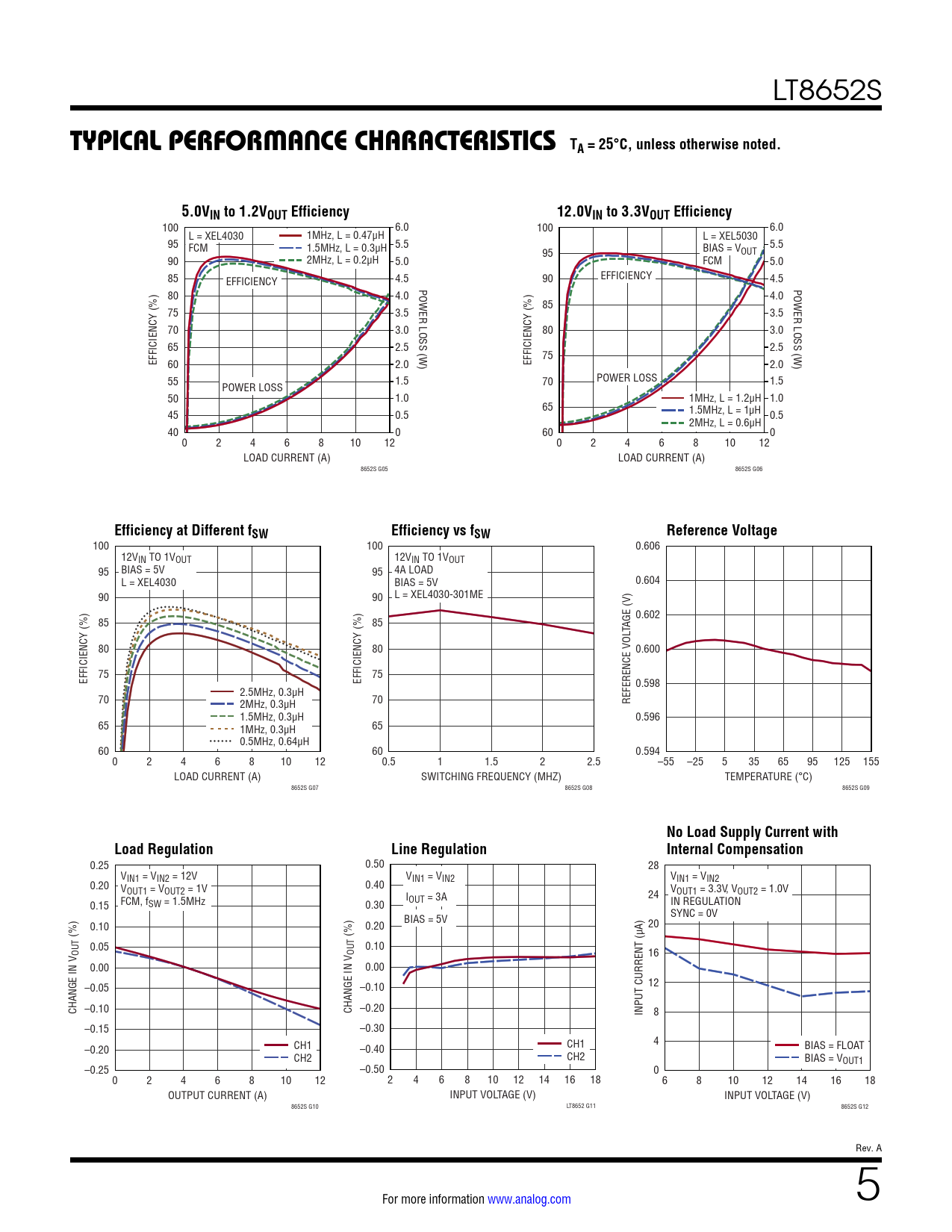 100 6.0 100 6.0 L = XEL4030 1MHz, L = 0.47µH L = XEL5030 95 5.5 FCM 1.5MHz, L = 0.3µH 5.5 95 BIAS = VOUT 90 2MHz, L = 0.2µH 5.0 FCM 5.0 85 4.5 EFFICIENCY 90 EFFICIENCY 4.5 POWER LOSS (W) POWER LOSS (W) 80 4.0 4.0 85 75 3.5 3.5 70 3.0 80 3.0 65 2.5 2.5 EFFICIENCY (%) 75 60 2.0 EFFICIENCY (%) 2.0 55 1.5 POWER LOSS POWER LOSS 70 1.5 50 1.0 1MHz, L = 1.2µH 1.0 65 45 0.5 1.5MHz, L = 1µH 0.5 2MHz, L = 0.6µH 40 0 60 0 0 2 4 6 8 10 12 0 2 4 6 8 10 12 LOAD CURRENT (A) LOAD CURRENT (A) 8652S G05 8652S G06