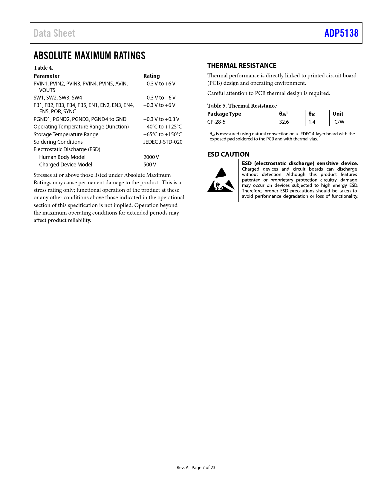 Pages / Page23 / 7 — Data Sheet. ADP5138. ABSOLUTE MAXIMUM RATINGS Table 4. THERMAL …