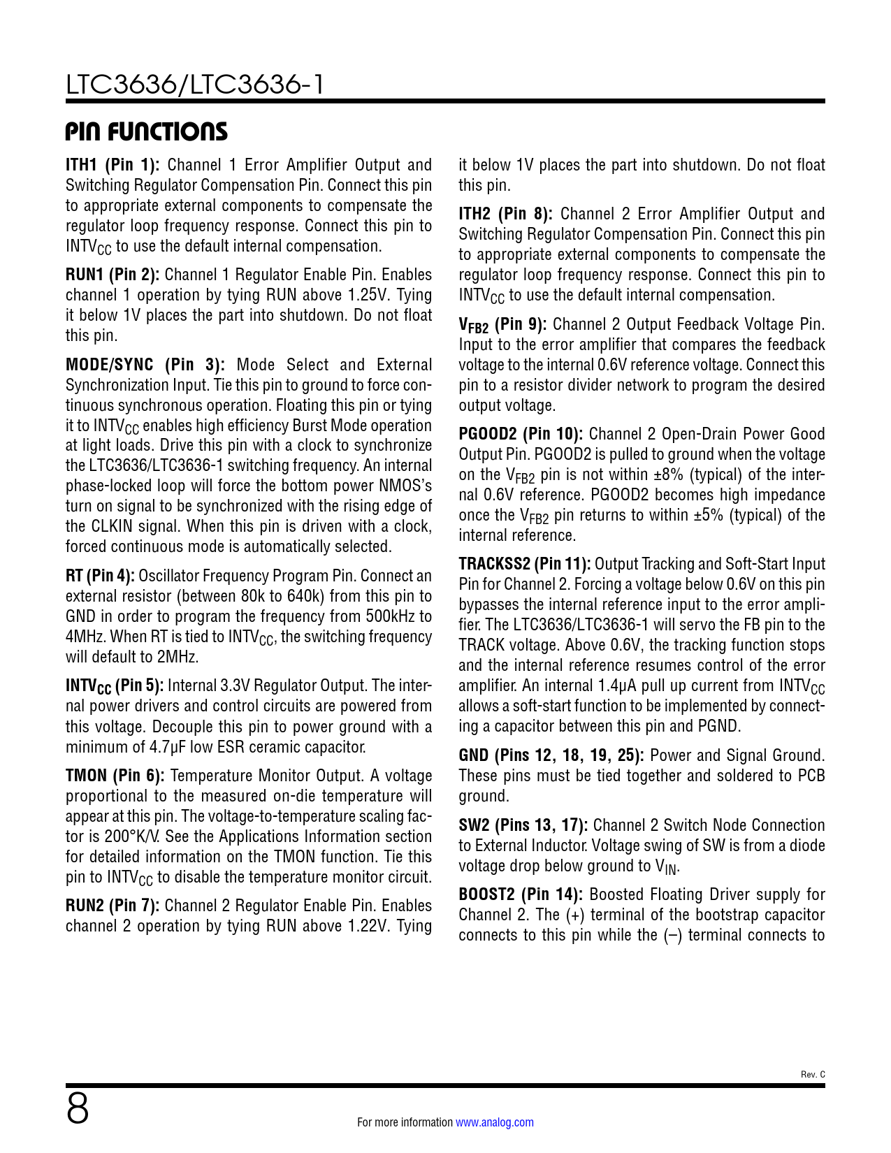link to page 18 LTC3636/LTC3636-1 PIN FUNCTIONSITH1 (Pin 1): Channel 1 Error Amplifier Output and it below 1V places the part into shutdown. Do not float Switching Regulator Compensation Pin. Connect this pin this pin. to appropriate external components to compensate the ITH2 (Pin 8): Channel 2 Error Amplifier Output and regulator loop frequency response. Connect this pin to Switching Regulator Compensation Pin. Connect this pin INTVCC to use the default internal compensation. to appropriate external components to compensate the RUN1 (Pin 2): Channel 1 Regulator Enable Pin. Enables regulator loop frequency response. Connect this pin to channel 1 operation by tying RUN above 1.25V. Tying INTVCC to use the default internal compensation. it below 1V places the part into shutdown. Do not float V this pin. FB2 (Pin 9): Channel 2 Output Feedback Voltage Pin. Input to the error amplifier that compares the feedback MODE/SYNC (Pin 3): Mode Select and External voltage to the internal 0.6V reference voltage. Connect this Synchronization Input. Tie this pin to ground to force con- pin to a resistor divider network to program the desired tinuous synchronous operation. Floating this pin or tying output voltage. it to INTVCC enables high efficiency Burst Mode operation PGOOD2 (Pin 10): Channel 2 Open-Drain Power Good at light loads. Drive this pin with a clock to synchronize Output Pin. PGOOD2 is pulled to ground when the voltage the LTC3636/LTC3636-1 switching frequency. An internal on the V phase-locked loop will force the bottom power NMOS’s FB2 pin is not within ±8% (typical) of the inter- nal 0.6V reference. PGOOD2 becomes high impedance turn on signal to be synchronized with the rising edge of once the V the CLKIN signal. When this pin is driven with a clock, FB2 pin returns to within ±5% (typical) of the internal reference. forced continuous mode is automatically selected. TRACKSS2 (Pin 11): Output Tracking and Soft-Start Input RT (Pin 4): Oscillator Frequency Program Pin. Connect an Pin for Channel 2. Forcing a voltage below 0.6V on this pin external resistor (between 80k to 640k) from this pin to bypasses the internal reference input to the error ampli- GND in order to program the frequency from 500kHz to fier. The LTC3636/LTC3636-1 will servo the FB pin to the 4MHz. When RT is tied to INTVCC, the switching frequency TRACK voltage. Above 0.6V, the tracking function stops will default to 2MHz. and the internal reference resumes control of the error INTVCC (Pin 5): Internal 3.3V Regulator Output. The inter- amplifier. An internal 1.4μA pull up current from INTVCC nal power drivers and control circuits are powered from allows a soft-start function to be implemented by connect- this voltage. Decouple this pin to power ground with a ing a capacitor between this pin and PGND. minimum of 4.7µF low ESR ceramic capacitor. GND (Pins 12, 18, 19, 25): Power and Signal Ground. TMON (Pin 6): Temperature Monitor Output. A voltage These pins must be tied together and soldered to PCB proportional to the measured on-die temperature will ground. appear at this pin. The voltage-to-temperature scaling fac- SW2 (Pins 13, 17): Channel 2 Switch Node Connection tor is 200°K/V. See the Applications Information section to External Inductor. Voltage swing of SW is from a diode for detailed information on the TMON function. Tie this voltage drop below ground to V pin to INTV IN. CC to disable the temperature monitor circuit. BOOST2 (Pin 14): Boosted Floating Driver supply for RUN2 (Pin 7): Channel 2 Regulator Enable Pin. Enables Channel 2. The (+) terminal of the bootstrap capacitor channel 2 operation by tying RUN above 1.22V. Tying connects to this pin while the (–) terminal connects to Rev. C 8 For more information www.analog.com Document Outline Features Applications Typical Application Description Absolute Maximum Ratings Order Information Pin Configuration Electrical Characteristics Typical Performance Characteristics Pin Functions Block Diagram Operation Applications Information Typical Applications Package Description Revision History Typical Application Related Parts
