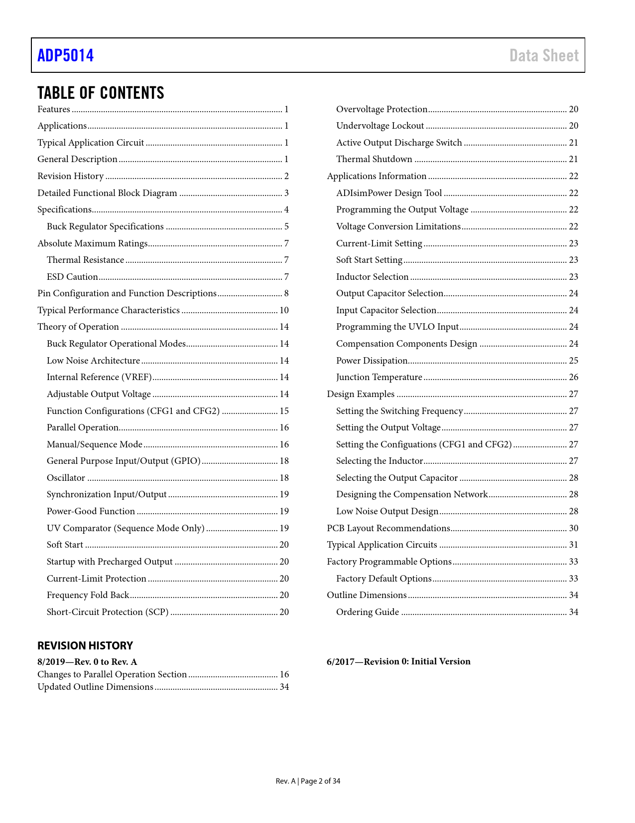 Pages / Page34 / 2 — ADP5014. Data Sheet. TABLE OF CONTENTS. REVISION HISTORY 8/2019—Rev. 0 to …