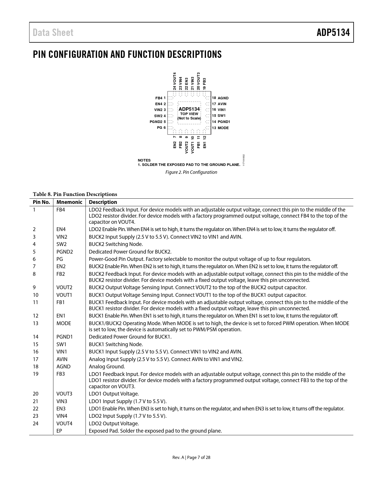 Data SheetADP5134PIN CONFIGURATION AND FUNCTION DESCRIPTIONS43TT43U3U3NNOINIOBVVEVVF432102222921FB4 118 AGNDEN4 217 AVINVIN2 3ADP513416 VIN1TOP VIEWSW2 415 SW1(Not to Scale)PGND2 514 PGND1PG 613 MODE789012111222111NBTTBNEFUUFEOOVV -002 NOTES 1. SOLDER THE EXPOSED PAD TO THE GROUND PLANE. 11710 Figure 2. Pin Configuration Table 8. Pin Function Descriptions PinNo. Mnemonic Description 1 FB4 LDO2 Feedback Input. For device models with an adjustable output voltage, connect this pin to the middle of the LDO2 resistor divider. For device models with a factory programmed output voltage, connect FB4 to the top of the capacitor on VOUT4. 2 EN4 LDO2 Enable Pin. When EN4 is set to high, it turns the regulator on. When EN4 is set to low, it turns the regulator off. 3 VIN2 BUCK2 Input Supply (2.5 V to 5.5 V). Connect VIN2 to VIN1 and AVIN. 4 SW2 BUCK2 Switching Node. 5 PGND2 Dedicated Power Ground for BUCK2. 6 PG Power-Good Pin Output. Factory selectable to monitor the output voltage of up to four regulators. 7 EN2 BUCK2 Enable Pin. When EN2 is set to high, it turns the regulator on. When EN2 is set to low, it turns the regulator off. 8 FB2 BUCK2 Feedback Input. For device models with an adjustable output voltage, connect this pin to the middle of the BUCK2 resistor divider. For device models with a fixed output voltage, leave this pin unconnected. 9 VOUT2 BUCK2 Output Voltage Sensing Input. Connect VOUT2 to the top of the BUCK2 output capacitor. 10 VOUT1 BUCK1 Output Voltage Sensing Input. Connect VOUT1 to the top of the BUCK1 output capacitor. 11 FB1 BUCK1 Feedback Input. For device models with an adjustable output voltage, connect this pin to the middle of the BUCK1 resistor divider. For device models with a fixed output voltage, leave this pin unconnected. 12 EN1 BUCK1 Enable Pin. When EN1 is set to high, it turns the regulator on. When EN1 is set to low, it turns the regulator off. 13 MODE BUCK1/BUCK2 Operating Mode. When MODE is set to high, the device is set to forced PWM operation. When MODE is set to low, the device is automatically set to PWM/PSM operation. 14 PGND1 Dedicated Power Ground for BUCK1. 15 SW1 BUCK1 Switching Node. 16 VIN1 BUCK1 Input Supply (2.5 V to 5.5 V). Connect VIN1 to VIN2 and AVIN. 17 AVIN Analog Input Supply (2.5 V to 5.5 V). Connect AVIN to VIN1 and VIN2. 18 AGND Analog Ground. 19 FB3 LDO1 Feedback Input. For device models with an adjustable output voltage, connect this pin to the middle of the LDO1 resistor divider. For device models with a factory programmed output voltage, connect FB3 to the top of the capacitor on VOUT3. 20 VOUT3 LDO1 Output Voltage. 21 VIN3 LDO1 Input Supply (1.7 V to 5.5 V). 22 EN3 LDO1 Enable Pin. When EN3 is set to high, it turns on the regulator, and when EN3 is set to low, it turns off the regulator. 23 VIN4 LDO2 Input Supply (1.7 V to 5.5 V). 24 VOUT4 LDO2 Output Voltage. EP Exposed Pad. Solder the exposed pad to the ground plane. Rev. A | Page 7 of 28 Document Outline FEATURES APPLICATIONS TYPICAL APPLICATION CIRCUIT GENERAL DESCRIPTION REVISION HISTORY SPECIFICATIONS GENERAL SPECIFICATIONS BUCK1 AND BUCK2 SPECIFICATIONS LDO1 AND LDO2 SPECIFICATIONS INPUT AND OUTPUT CAPACITOR, RECOMMENDED SPECIFICATIONS ABSOLUTE MAXIMUM RATINGS THERMAL RESISTANCE ESD CAUTION PIN CONFIGURATION AND FUNCTION DESCRIPTIONS TYPICAL PERFORMANCE CHARACTERISTICS THEORY OF OPERATION POWER MANAGEMENT UNIT Power-Good Output Thermal Protection Undervoltage Lockout Precision Enable and Shutdown Control BUCK1 AND BUCK2 Control Scheme PWM Mode Power Save Mode (PSM) PSM Current Threshold Oscillator and Phasing of Inductor Switching Short-Circuit Protection Buck Regulator Soft Start Current Limit 100% Duty Operation Active Pull-Down Resistors LDO1 AND LDO2 LDO Regulator Soft Start APPLICATIONS INFORMATION BUCK REGULATOR EXTERNAL COMPONENT SELECTION Feedback Resistors Inductor Output Capacitor Input Capacitor LDO REGULATOR EXTERNAL COMPONENT SELECTION Feedback Resistors Output Capacitor Input Bypass Capacitor Input and Output Capacitor Properties POWER DISSIPATION AND THERMAL CONSIDERATIONS BUCK REGULATOR POWER DISSIPATION LDO Regulator Power Dissipation JUNCTION TEMPERATURE PCB LAYOUT GUIDELINES TYPICAL APPLICATION SCHEMATICS BILL OF MATERIALS OUTLINE DIMENSIONS ORDERING GUIDE