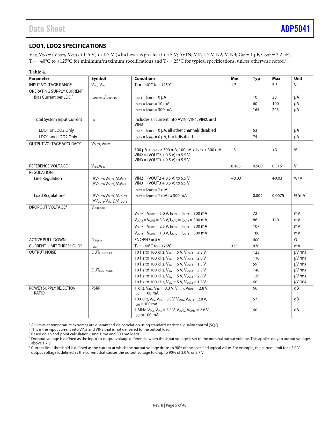 Pages / Page40 / 5 — Data Sheet. ADP5041. LDO1, LDO2 SPECIFICATIONS. Table 4. Parameter. …