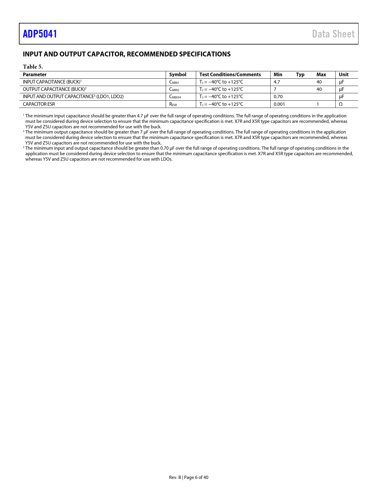 ADP5041Data SheetINPUT AND OUTPUT CAPACITOR, RECOMMENDED SPECIFICATIONSTable 5. ParameterSymbolTest Conditions/Comments Min Typ Max Unit INPUT CAPACITANCE (BUCK)1 CMIN1 TJ = −40°C to +125°C 4.7 40 μF OUTPUT CAPACITANCE (BUCK)2 CMIN2 TJ = −40°C to +125°C 7 40 μF INPUT AND OUTPUT CAPACITANCE3 (LDO1, LDO2) CMIN34 TJ = −40°C to +125°C 0.70 μF CAPACITOR ESR RESR TJ = −40°C to +125°C 0.001 1 Ω 1 The minimum input capacitance should be greater than 4.7 μF over the full range of operating conditions. The full range of operating conditions in the application must be considered during device selection to ensure that the minimum capacitance specification is met. X7R and X5R type capacitors are recommended, whereas Y5V and Z5U capacitors are not recommended for use with the buck. 2 The minimum output capacitance should be greater than 7 μF over the full range of operating conditions. The full range of operating conditions in the application must be considered during device selection to ensure that the minimum capacitance specification is met. X7R and X5R type capacitors are recommended, whereas Y5V and Z5U capacitors are not recommended for use with the buck. 3 The minimum input and output capacitance should be greater than 0.70 μF over the full range of operating conditions. The full range of operating conditions in the application must be considered during device selection to ensure that the minimum capacitance specification is met. X7R and X5R type capacitors are recommended, whereas Y5V and Z5U capacitors are not recommended for use with LDOs. Rev. B | Page 6 of 40 Document Outline FEATURES FUNCTIONAL BLOCK DIAGRAM GENERAL DESCRIPTION TABLE OF CONTENTS REVISION HISTORY SPECIFICATIONS GENERAL SPECIFICATIONS SUPERVISORY SPECIFICATIONS BUCK SPECIFICATIONS LDO1, LDO2 SPECIFICATIONS INPUT AND OUTPUT CAPACITOR, RECOMMENDED SPECIFICATIONS ABSOLUTE MAXIMUM RATINGS THERMAL RESISTANCE ESD CAUTION PIN CONFIGURATION AND FUNCTION DESCRIPTIONS TYPICAL PERFORMANCE CHARACTERISTICS THEORY OF OPERATION POWER MANAGEMENT UNIT Thermal Protection Undervoltage Lockout Enable/Shutdown Active Pull-Down BUCK SECTION Control Scheme PWM Mode Power Save Mode (PSM) PSM Current Threshold Short-Circuit Protection Soft Start Current Limit 100% Duty Operation LDO SECTION SUPERVISORY SECTION Reset Output Manual Reset Input Watchdog Input APPLICATIONS INFORMATION BUCK EXTERNAL COMPONENT SELECTION Feedback Resistors Inductor Output Capacitor Input Capacitor LDO EXTERNAL COMPONENT SELECTION Feedback Resistors OUTPUT CAPACITOR Input Bypass Capacitor Input and Output Capacitor Properties SUPERVISORY SECTION Threshold Setting Resistors Watchdog Input Current Negative-Going Transients at the Monitored Rail Watchdog Software Considerations POWER DISSIPATION/THERMAL CONSIDERATIONS Buck Regulator Power Dissipation LDO Regulator Power Dissipation Junction Temperature APPLICATION DIAGRAM PCB LAYOUT GUIDELINES SUGGESTED LAYOUT BILL OF MATERIALS FACTORY PROGRAMMABLE OPTIONS OUTLINE DIMENSIONS ORDERING GUIDE