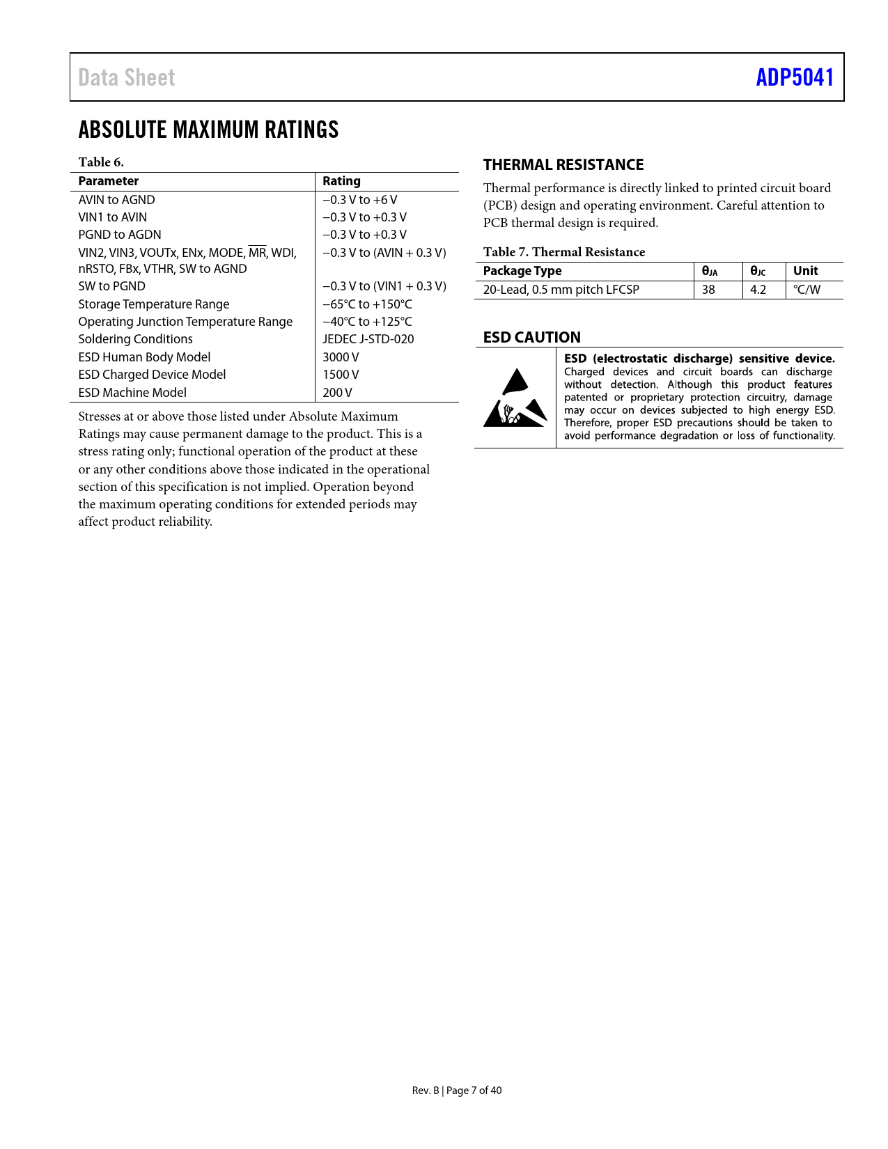 Data SheetADP5041ABSOLUTE MAXIMUM RATINGSTable 6.THERMAL RESISTANCEParameter Rating Thermal performance is directly linked to printed circuit board AVIN to AGND −0.3 V to +6 V (PCB) design and operating environment. Careful attention to VIN1 to AVIN −0.3 V to +0.3 V PCB thermal design is required. PGND to AGDN −0.3 V to +0.3 V VIN2, VIN3, VOUTx, ENx, MODE, MR, WDI, −0.3 V to (AVIN + 0.3 V) Table 7. Thermal Resistance nRSTO, FBx, VTHR, SW to AGND Package TypeθJAθJC Unit SW to PGND −0.3 V to (VIN1 + 0.3 V) 20-Lead, 0.5 mm pitch LFCSP 38 4.2 °C/W Storage Temperature Range −65°C to +150°C Operating Junction Temperature Range −40°C to +125°C Soldering Conditions JEDEC J-STD-020 ESD CAUTION ESD Human Body Model 3000 V ESD Charged Device Model 1500 V ESD Machine Model 200 V Stresses at or above those listed under Absolute Maximum Ratings may cause permanent damage to the product. This is a stress rating only; functional operation of the product at these or any other conditions above those indicated in the operational section of this specification is not implied. Operation beyond the maximum operating conditions for extended periods may affect product reliability. Rev. B | Page 7 of 40 Document Outline FEATURES FUNCTIONAL BLOCK DIAGRAM GENERAL DESCRIPTION TABLE OF CONTENTS REVISION HISTORY SPECIFICATIONS GENERAL SPECIFICATIONS SUPERVISORY SPECIFICATIONS BUCK SPECIFICATIONS LDO1, LDO2 SPECIFICATIONS INPUT AND OUTPUT CAPACITOR, RECOMMENDED SPECIFICATIONS ABSOLUTE MAXIMUM RATINGS THERMAL RESISTANCE ESD CAUTION PIN CONFIGURATION AND FUNCTION DESCRIPTIONS TYPICAL PERFORMANCE CHARACTERISTICS THEORY OF OPERATION POWER MANAGEMENT UNIT Thermal Protection Undervoltage Lockout Enable/Shutdown Active Pull-Down BUCK SECTION Control Scheme PWM Mode Power Save Mode (PSM) PSM Current Threshold Short-Circuit Protection Soft Start Current Limit 100% Duty Operation LDO SECTION SUPERVISORY SECTION Reset Output Manual Reset Input Watchdog Input APPLICATIONS INFORMATION BUCK EXTERNAL COMPONENT SELECTION Feedback Resistors Inductor Output Capacitor Input Capacitor LDO EXTERNAL COMPONENT SELECTION Feedback Resistors OUTPUT CAPACITOR Input Bypass Capacitor Input and Output Capacitor Properties SUPERVISORY SECTION Threshold Setting Resistors Watchdog Input Current Negative-Going Transients at the Monitored Rail Watchdog Software Considerations POWER DISSIPATION/THERMAL CONSIDERATIONS Buck Regulator Power Dissipation LDO Regulator Power Dissipation Junction Temperature APPLICATION DIAGRAM PCB LAYOUT GUIDELINES SUGGESTED LAYOUT BILL OF MATERIALS FACTORY PROGRAMMABLE OPTIONS OUTLINE DIMENSIONS ORDERING GUIDE