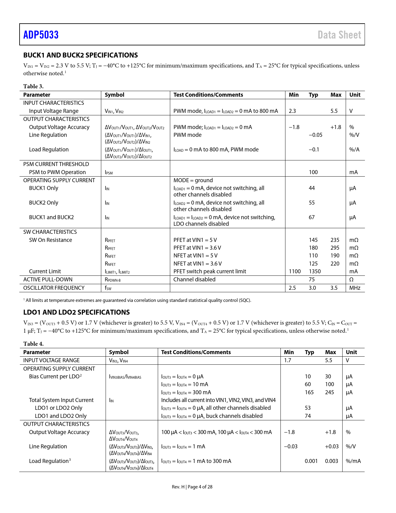 Pages / Page28 / 4 — ADP5033. Data Sheet. BUCK1 AND BUCK2 SPECIFICATIONS. Table 3. Parameter. …