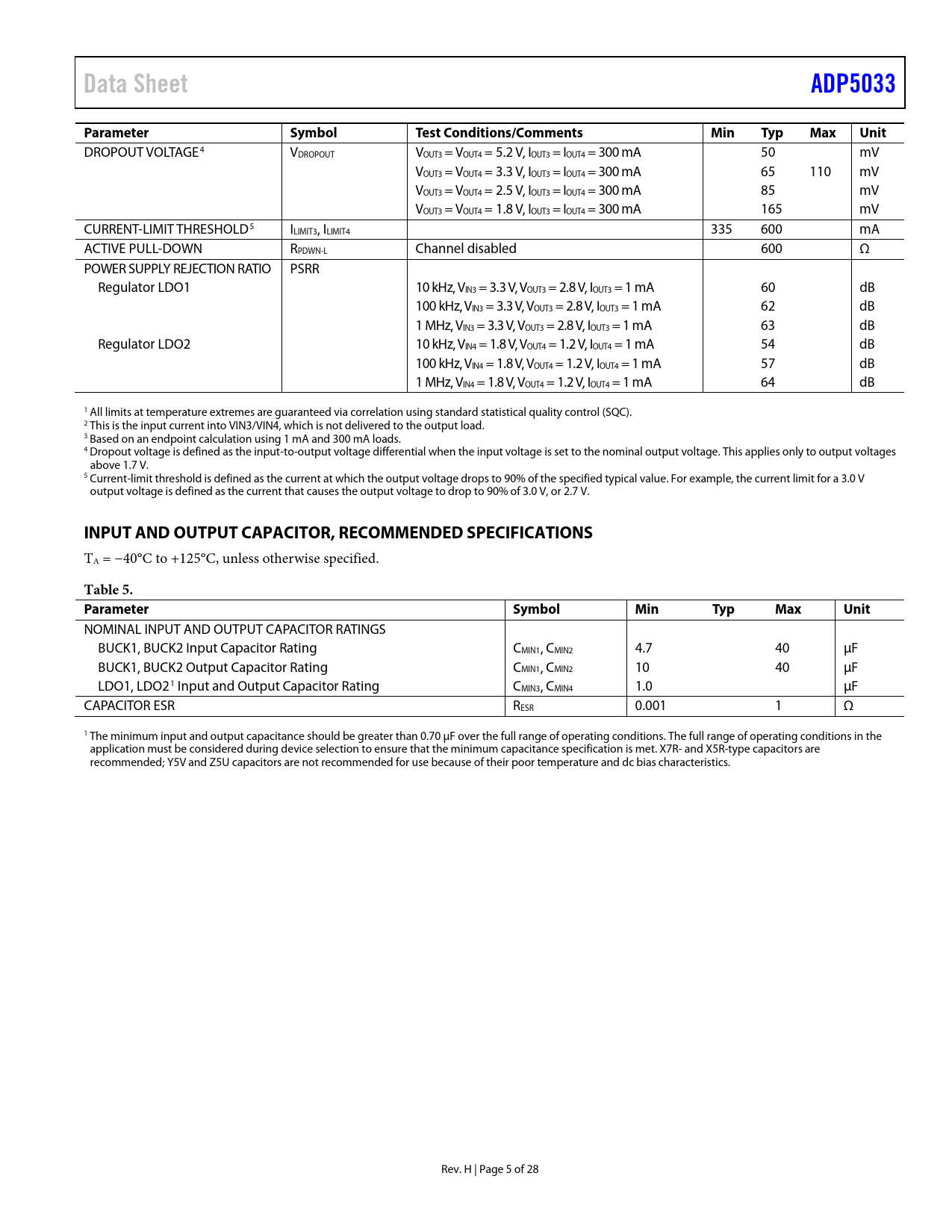 Pages / Page28 / 5 — Data Sheet. ADP5033. Parameter. Symbol. Test Conditions/Comments. Min. …
