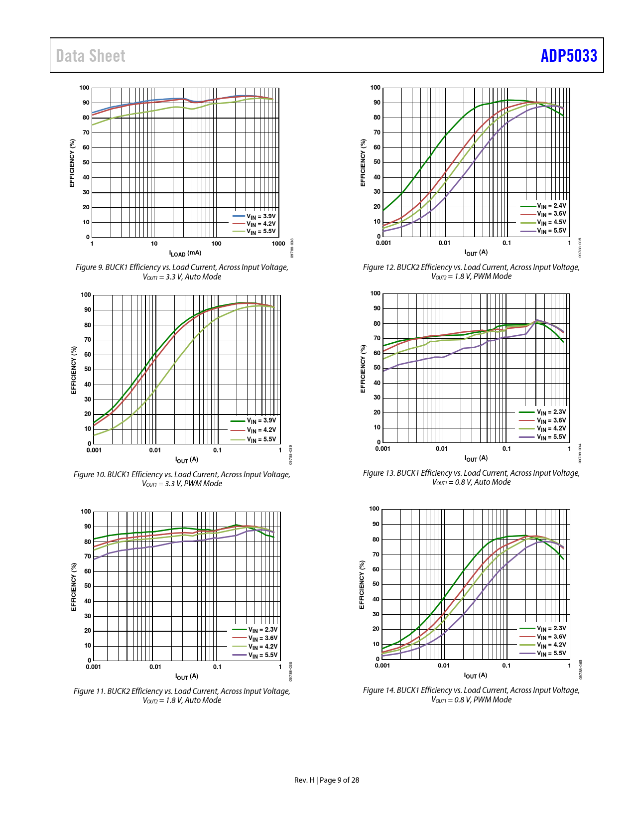 09788- 09788- Figure 10. BUCK1 Efficiency vs. Load Current, Across Input Voltage, Figure 13. BUCK1 Efficiency vs. Load Current, Across Input Voltage, V V OUT1 = 3.3 V, PWM Mode OUT1 = 0.8 V, Auto Mode