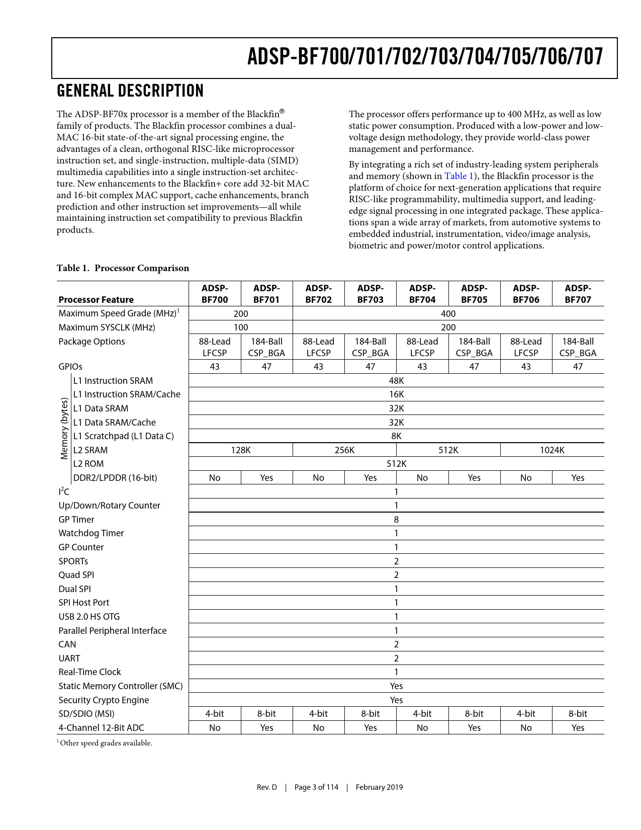 Table 1. Processor Comparison ADSP- ADSP- ADSP- ADSP- ADSP- ADSP- ADSP- ADSP- Processor Feature BF700 BF701 BF702 BF703 BF704 BF705 BF706 BF707