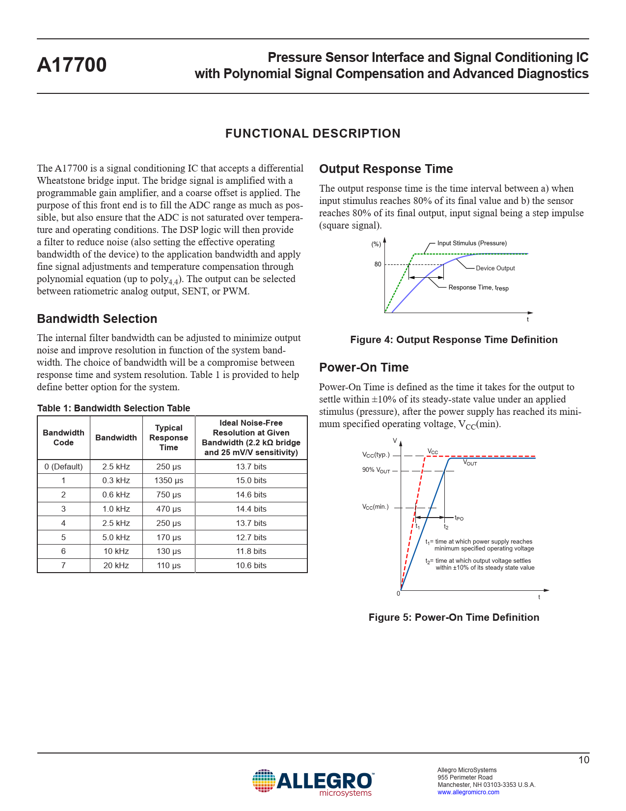 10 Allegro MicroSystems 955 Perimeter Road Manchester, NH 03103-3353 U.S.A. www.allegromicro.com Document Outline Features and Benefits Description Package Functional Block Diagram Selection Guide Absolute Maximum Ratings Thermal Characteristics Pinout Diagram and Terminal List Operating Characteristics Functional Description Bandwidth Selection Output Response Time Power-On Time Front End Gain Adjustment Front End Differential Offset Adjustment Input Signal Range Calculation Fine Adjustment and Temperature Compensation Output Protocols Digital Output Mode Selection Digital Output Driver Fall Time Selection Broken Wire Detection Diagnostic Features Programming: Manchester Communication Entering Manchester Coding Manchester Interface Message Structure CRC Device Access Shadow Registers Device EEPROM and Register Access Lock EEPROM Map Volatile Registers Map Power Derating Package Outline Drawing