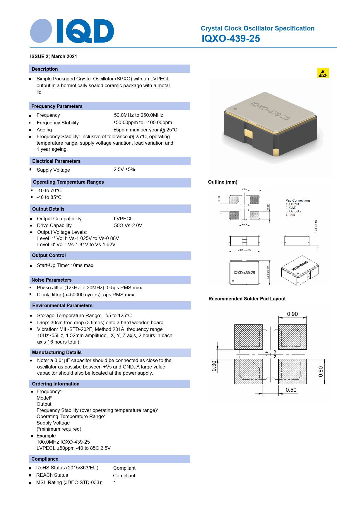 Crystal Clock Oscillator SpecificationIQXO-439-25ISSUE 2; March 2021Description Simple Packaged Crystal Oscillator (SPXO) with an LVPECL output in a hermetically sealed ceramic package with a metal lid. Frequency Parameters Frequency 50.0MHz to 250.0MHz Frequency Stability ±50.00ppm to ±100.00ppm Ageing ±5ppm max per year @ 25°C Frequency Stability: Inclusive of tolerance @ 25°C, operating temperature range, supply voltage variation, load variation and 1 year ageing. Electrical Parameters Supply Voltage 2.5V ±5% Operating Temperature RangesOutline (mm) -10 to 70°C -40 to 85°C Output Details Output Compatibility LVPECL Drive Capability 50Ω Vs-2.0V Output Voltage Levels: Level '1' VoH: Vs-1.025V to Vs-0.88V Level '0' VoL: Vs-1.81V to Vs-1.62V Output Control Start-Up Time: 10ms max Noise Parameters Phase Jitter (12kHz to 20MHz): 0.5ps RMS max Clock Jitter (n=50000 cycles): 5ps RMS max Recommended Solder Pad LayoutEnvironmental Parameters Storage Temperature Range: –55 to 125°C Drop: 30cm free drop (3 times) onto a hard wooden board. Vibration: MIL-STD-202F, Method 201A, frequency range 10Hz~55Hz, 1.52mm amplitude, X, Y, Z axis, 2 hours in each axis ( 6 hours total). Manufacturing Details Note: a 0.01μF capacitor should be connected as close to the oscillator as possibe between +Vs and GND. A large value capacitor should also be located at the power supply. Ordering Information Frequency* Model* Output Frequency Stability (over operating temperature range)* Operating Temperature Range* Supply Voltage (*minimum required) Example 100.0MHz IQXO-439-25 LVPECL ±50ppm -40 to 85C 2.5V Compliance RoHS Status (2015/863/EU) Compliant REACh Status Compliant MSL Rating (JDEC-STD-033): 1