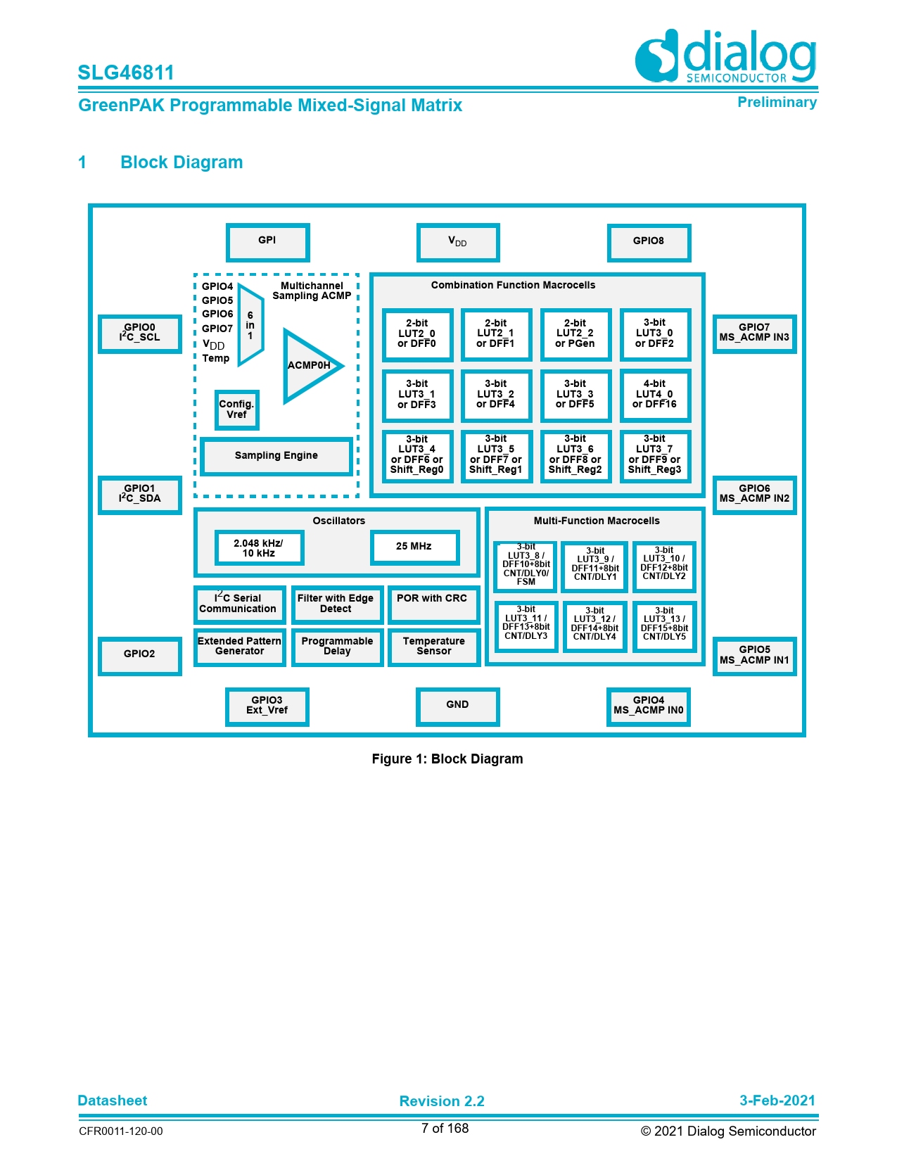 | Pages / Page | 168 / 7 — SLG46811. GreenPAK Programmable Mixed-Signal Matrix. Preliminary. Block … |