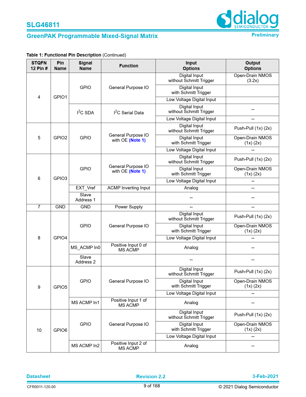 | Pages / Page | 168 / 9 — SLG46811. GreenPAK Programmable Mixed-Signal Matrix. Preliminary. Table … |