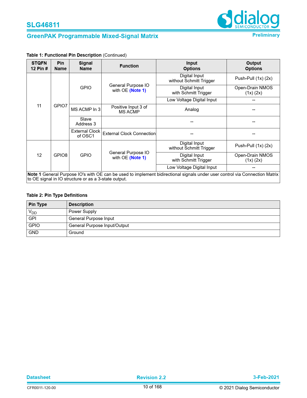 | Pages / Page | 168 / 10 — SLG46811. GreenPAK Programmable Mixed-Signal Matrix. Preliminary. Table … |