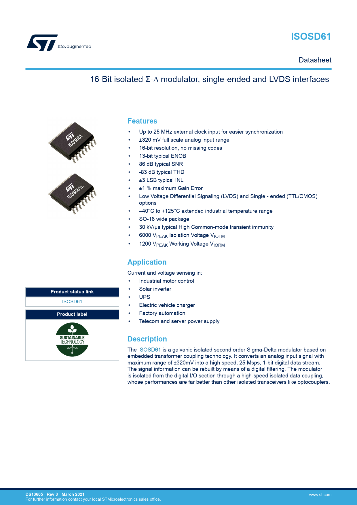 ISOSD61 Datasheet 16-Bit isolated Σ-∆ modulator, single-ended and LVDS interfaces Features • Up to 25 MHz external clock input for easier synchronization • ±320 mV full scale analog input range • 16-bit resolution, no missing codes • 13-bit typical ENOB • 86 dB typical SNR • -83 dB typical THD • ±3 LSB typical INL • ±1 % maximum Gain Error • Low Voltage Differential Signaling (LVDS) and Single - ended (TTL/CMOS) options • –40°C to +125°C extended industrial temperature range • SO-16 wide package • 30 kV/µs typical High Common-mode transient immunity • 6000 VPEAK Isolation Voltage VIOTM • 1200 VPEAK Working Voltage VIORM Application Current and voltage sensing in: • Industrial motor control • Solar inverter Product status link • UPS ISOSD61 • Electric vehicle charger Product label • Factory automation • Telecom and server power supply Description The ISOSD61 is a galvanic isolated second order Sigma-Delta modulator based on embedded transformer coupling technology. It converts an analog input signal with maximum range of ±320mV into a high speed, 25 Msps, 1-bit digital data stream. The signal information can be rebuilt by means of a digital filtering. The modulator is isolated from the digital I/O section through a high-speed isolated data coupling, whose performances are far better than other isolated transceivers like optocouplers. DS13605 - Rev 3 - March 2021 www.st.com For further information contact your local STMicroelectronics sales office. Document Outline Cover image Product status link / summary Features Application Description 1 Device overview 2 Pin description 3 Device specifications 4 Terminology 5 Theory of operation 6 Package description 7 Ordering information Revision history Contents List of tables List of figures