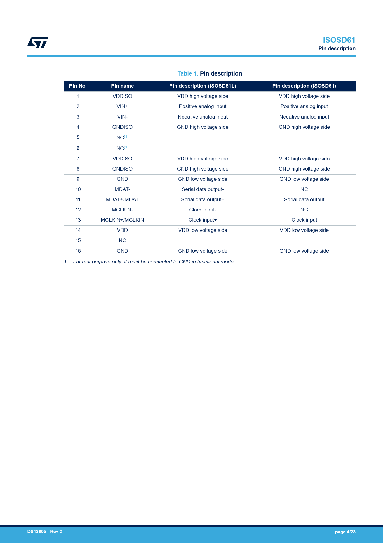 ISOSD61 Pin description Table 1 Pin description Pin No Pin name Pin description (ISOSD61L) Pin description (ISOSD61) DS13605