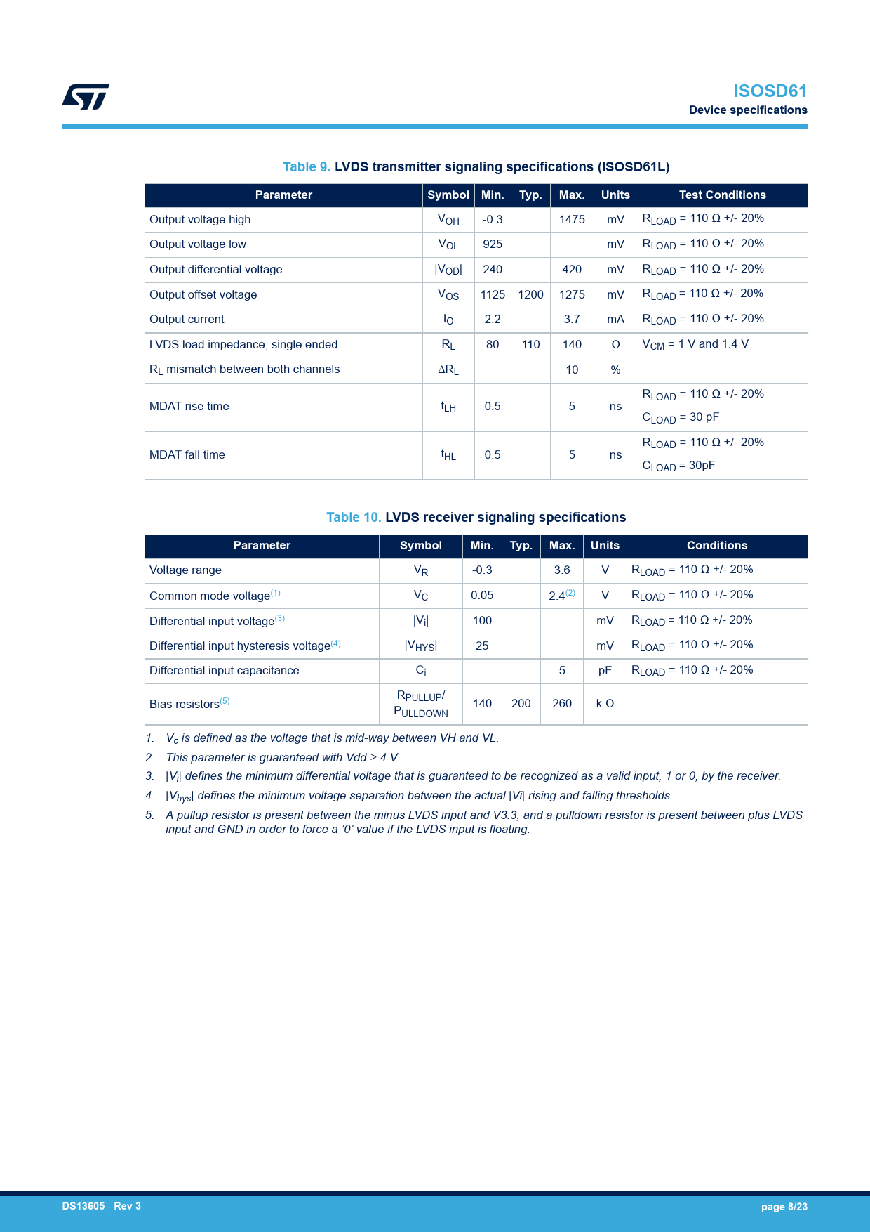 Pages / Page23 / 8 — ISOSD61. Device specifications. Table 9. LVDS transmitter signaling …