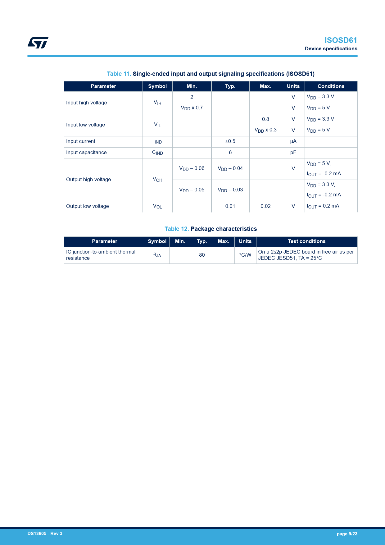 Pages / Page23 / 9 — ISOSD61. Device specifications. Table 11. Single-ended input and output …