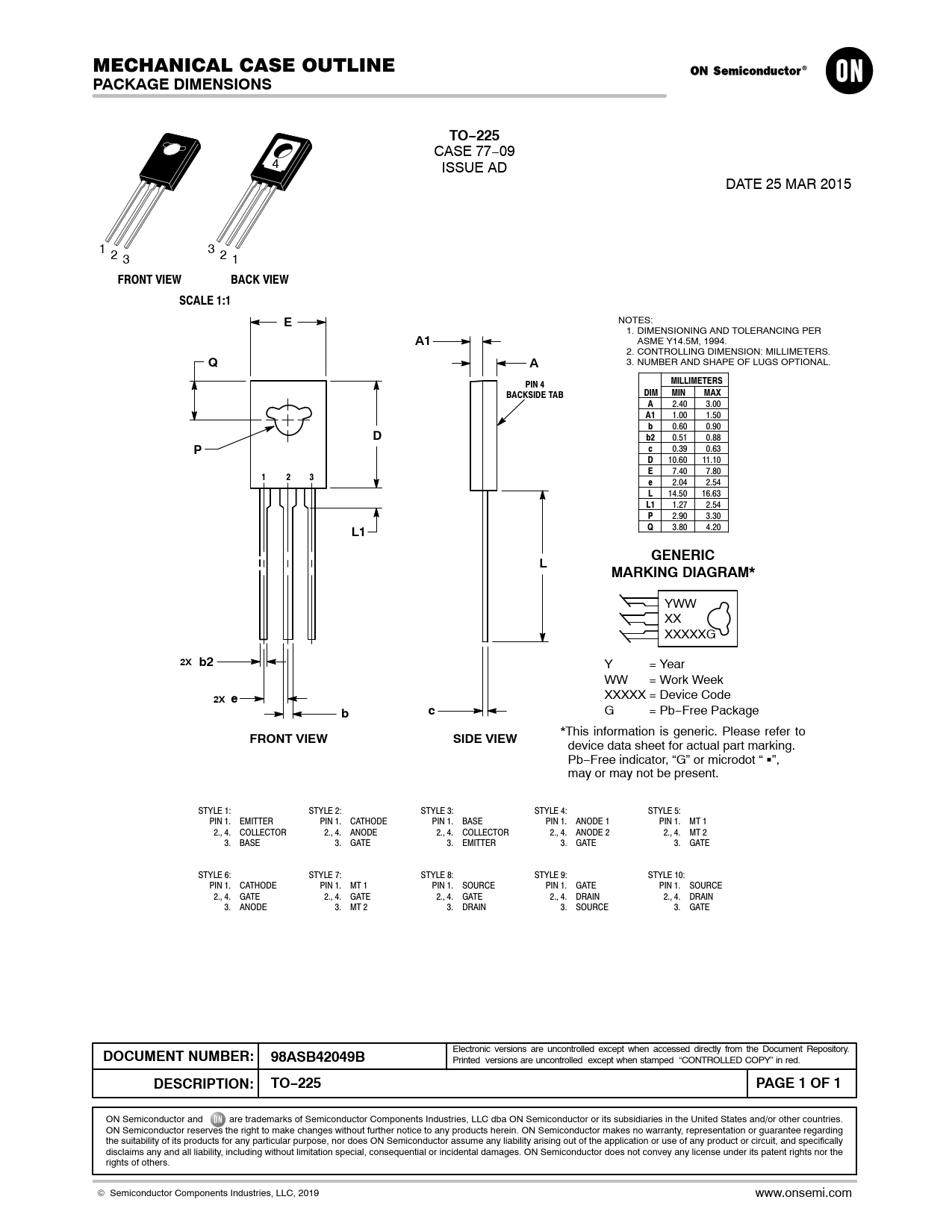 PACKAGE DIMENSIONS. TO−225. FRONT VIEW. BACK VIEW. SCALE 1:1. MILLIMETERS. PIN 4. DIM. MIN. MAX. BACKSIDE TAB. GENERIC. MARKING DIAGRAM*. 2X b2
