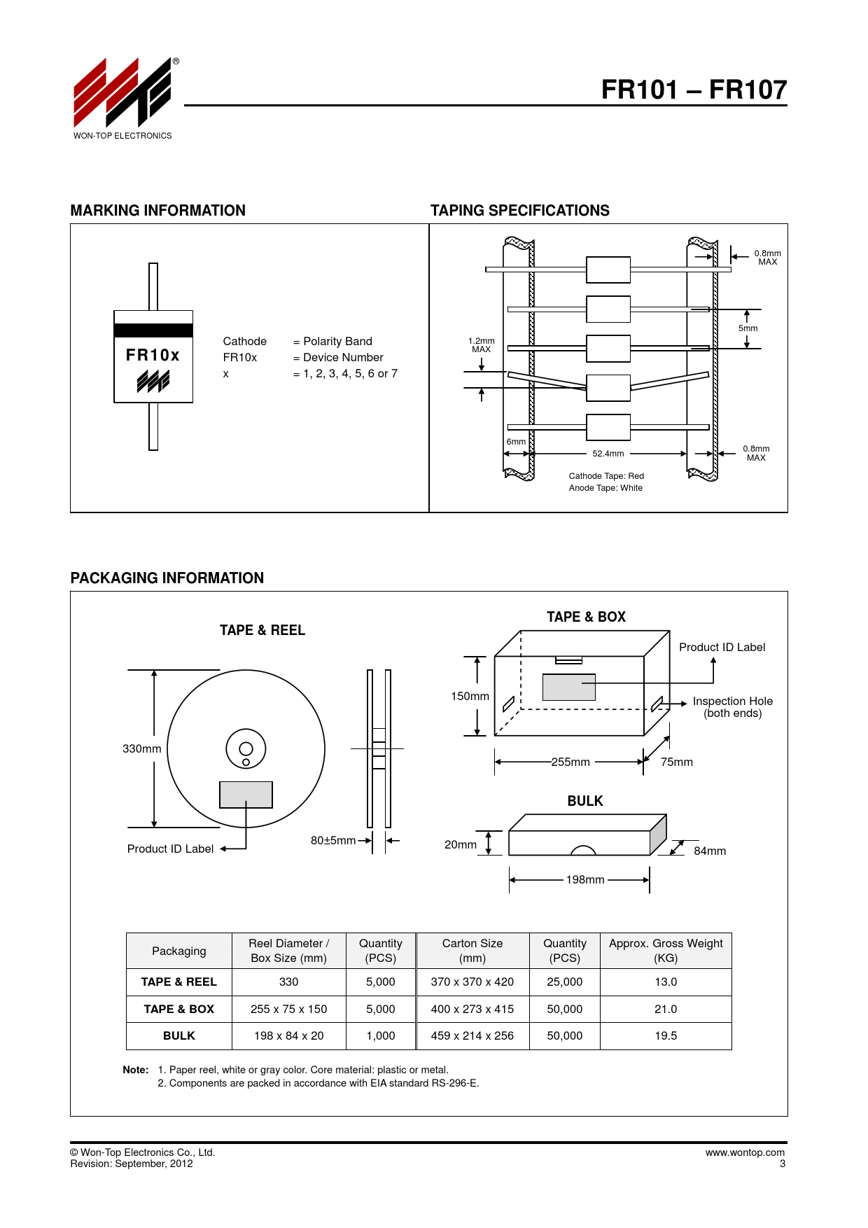 ® FR101 – FR107. WON-TOP ELECTRONICS MARKING INFORMATION TAPING SPECIFICATIONS. 0.8mm. MAX 5mm FR10x Cathode. FR10x