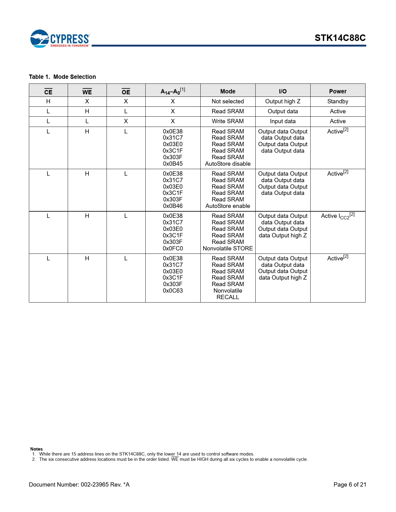 link to page 6 link to page 6 link to page 6 link to page 6 link to page 6 STK14C88CTable 1. Mode SelectionCEWEOEA [1] 14–A0ModeI/OPower H X X X Not selected Output high Z Standby L H L X Read SRAM Output data Active L L X X Write SRAM Input data Active L H L 0x0E38 Read SRAM Output data Output Active[2] 0x31C7 Read SRAM data Output data 0x03E0 Read SRAM Output data Output 0x3C1F Read SRAM data Output data 0x303F Read SRAM 0x0B45 AutoStore disable L H L 0x0E38 Read SRAM Output data Output Active[2] 0x31C7 Read SRAM data Output data 0x03E0 Read SRAM Output data Output 0x3C1F Read SRAM data Output data 0x303F Read SRAM 0x0B46 AutoStore enable L H L 0x0E38 Read SRAM Output data Output Active I [2] CC2 0x31C7 Read SRAM data Output data 0x03E0 Read SRAM Output data Output 0x3C1F Read SRAM data Output high Z 0x303F Read SRAM 0x0FC0 Nonvolatile STORE L H L 0x0E38 Read SRAM Output data Output Active[2] 0x31C7 Read SRAM data Output data 0x03E0 Read SRAM Output data Output 0x3C1F Read SRAM data Output high Z 0x303F Read SRAM 0x0C63 Nonvolatile RECALL Notes 1. While there are 15 address lines on the STK14C88C, only the lower 14 are used to control software modes. 2. The six consecutive address locations must be in the order listed. WE must be HIGH during all six cycles to enable a nonvolatile cycle. Document Number: 002-23965 Rev. *A Page 6 of 21 Document Outline 256-Kbit (32K × 8) nvSRAM Features Functional Description Logic Block Diagram Contents Pinout Pin Definitions Device Operation SRAM Read SRAM Write AutoStore Operation Hardware STORE Operation Hardware RECALL (Power-up) Software STORE Software RECALL Preventing AutoStore Data Protection Maximum Ratings Operating Range DC Electrical Characteristics Data Retention and Endurance Capacitance Thermal Resistance AC Test Loads AC Test Conditions AC Switching Characteristics SRAM Read Cycle SRAM Write Cycle Switching Waveforms AutoStore/Power-up RECALL Switching Waveforms Software Controlled STORE/RECALL Cycle Switching Waveforms Hardware STORE Cycle Switching Waveforms Truth Table For SRAM Operations Ordering Information Ordering Code Definitions for Industrial Temperature Ordering Code Definitions for Military Temperature Package Diagram Acronyms Document Conventions Units of Measure Document History Page Sales, Solutions, and Legal Information Worldwide Sales and Design Support Products PSoC® Solutions Cypress Developer Community Technical Support