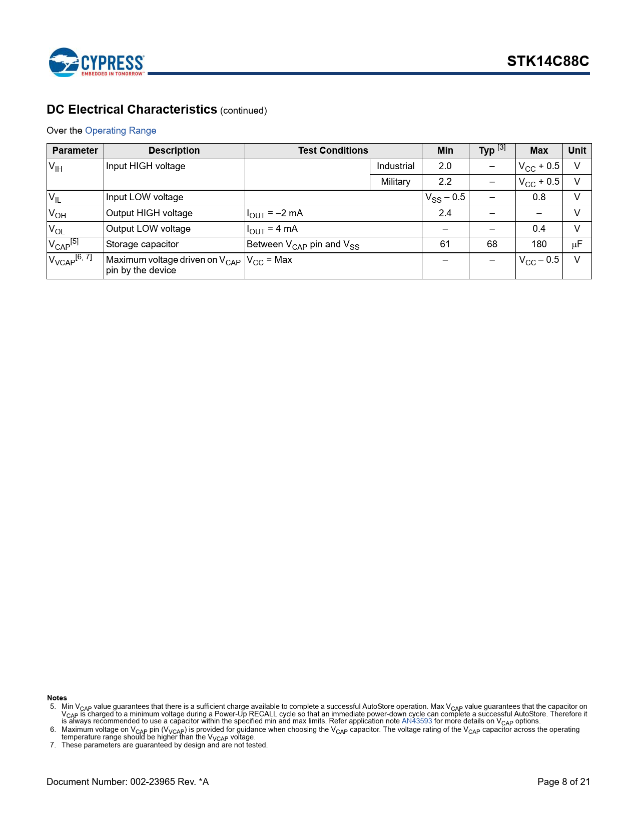 VIH Input HIGH voltage Industrial 2.0 – VCC + 0.5 V Military 2.2 – VCC + 0.5 V VIL Input LOW voltage VSS – 0.5 – 0.8 V VOH Output HIGH voltage IOUT = –2 mA 2.4 – – V VOL Output LOW voltage IOUT = 4 mA – – 0.4 V V [5] CAP Storage capacitor Between VCAP pin and VSS 61 68 180 F V [6, 7] VCAP Maximum voltage driven on VCAP VCC = Max – – VCC – 0.5 V pin by the device