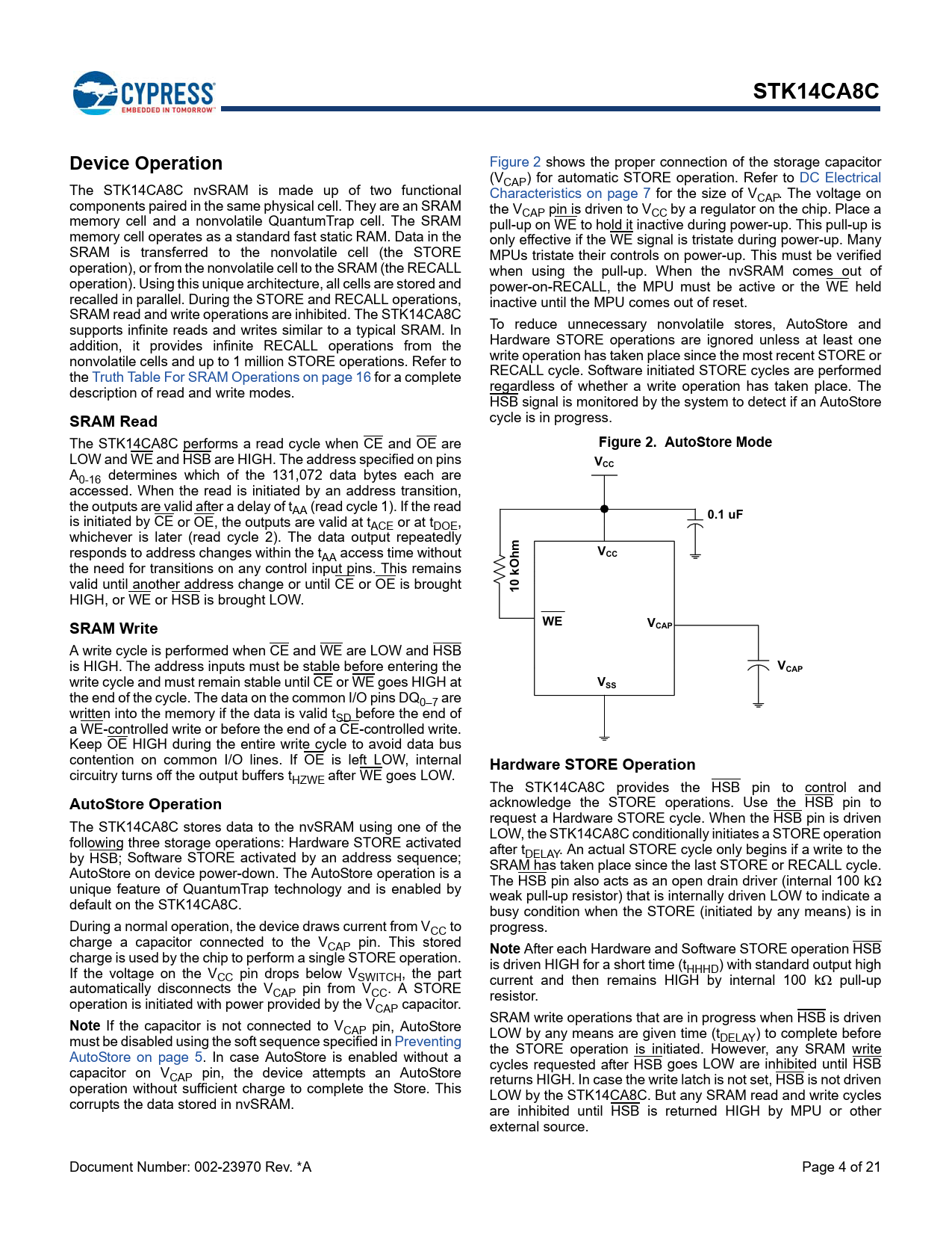 link to page 5 link to page 5 link to page 16 link to page 4 link to page 7 link to page 7 STK14CA8CDevice Operation Figure 2 shows the proper connection of the storage capacitor (VCAP) for automatic STORE operation. Refer to DC Electrical The STK14CA8C nvSRAM is made up of two functional Characteristics on page 7 for the size of VCAP. The voltage on components paired in the same physical cell. They are an SRAM the VCAP pin is driven to VCC by a regulator on the chip. Place a memory cell and a nonvolatile QuantumTrap cell. The SRAM pull-up on WE to hold it inactive during power-up. This pull-up is memory cell operates as a standard fast static RAM. Data in the only effective if the WE signal is tristate during power-up. Many SRAM is transferred to the nonvolatile cell (the STORE MPUs tristate their controls on power-up. This must be verified operation), or from the nonvolatile cell to the SRAM (the RECALL when using the pull-up. When the nvSRAM comes out of operation). Using this unique architecture, all cells are stored and power-on-RECALL, the MPU must be active or the WE held recalled in parallel. During the STORE and RECALL operations, inactive until the MPU comes out of reset. SRAM read and write operations are inhibited. The STK14CA8C supports infinite reads and writes similar to a typical SRAM. In To reduce unnecessary nonvolatile stores, AutoStore and addition, it provides infinite RECALL operations from the Hardware STORE operations are ignored unless at least one nonvolatile cells and up to 1 million STORE operations. Refer to write operation has taken place since the most recent STORE or the Truth Table For SRAM Operations on page 16 for a complete RECALL cycle. Software initiated STORE cycles are performed description of read and write modes. regardless of whether a write operation has taken place. The HSB signal is monitored by the system to detect if an AutoStore SRAM Read cycle is in progress. The STK14CA8C performs a read cycle when CE and OE are Figure 2. AutoStore Mode LOW and WE and HSB are HIGH. The address specified on pins VCC A0-16 determines which of the 131,072 data bytes each are accessed. When the read is initiated by an address transition, the outputs are valid after a delay of tAA (read cycle 1). If the read is initiated by CE or OE, the outputs are valid at t 0.1 uF ACE or at tDOE, whichever is later (read cycle 2). The data output repeatedly responds to address changes within the tAA access time without VCC the need for transitions on any control input pins. This remains valid until another address change or until CE or OE is brought 10 kOhm HIGH, or WE or HSB is brought LOW. SRAM WriteWEVCAP A write cycle is performed when CE and WE are LOW and HSB is HIGH. The address inputs must be stable before entering the VCAP write cycle and must remain stable until CE or WE goes HIGH at VSS the end of the cycle. The data on the common I/O pins DQ0–7 are written into the memory if the data is valid tSD before the end of a WE-controlled write or before the end of a CE-controlled write. Keep OE HIGH during the entire write cycle to avoid data bus contention on common I/O lines. If OE is left LOW, internal Hardware STORE Operation circuitry turns off the output buffers tHZWE after WE goes LOW. The STK14CA8C provides the HSB pin to control and AutoStore Operation acknowledge the STORE operations. Use the HSB pin to request a Hardware STORE cycle. When the HSB pin is driven The STK14CA8C stores data to the nvSRAM using one of the LOW, the STK14CA8C conditionally initiates a STORE operation following three storage operations: Hardware STORE activated after t by HSB; Software STORE activated by an address sequence; DELAY. An actual STORE cycle only begins if a write to the SRAM has taken place since the last STORE or RECALL cycle. AutoStore on device power-down. The AutoStore operation is a The HSB pin also acts as an open drain driver (internal 100 k unique feature of QuantumTrap technology and is enabled by weak pull-up resistor) that is internally driven LOW to indicate a default on the STK14CA8C. busy condition when the STORE (initiated by any means) is in During a normal operation, the device draws current from VCC to progress. charge a capacitor connected to the VCAP pin. This stored Note After each Hardware and Software STORE operation HSB charge is used by the chip to perform a single STORE operation. is driven HIGH for a short time (t If the voltage on the V HHHD) with standard output high CC pin drops below VSWITCH, the part current and then remains HIGH by internal 100 k pull-up automatically disconnects the VCAP pin from VCC. A STORE resistor. operation is initiated with power provided by the VCAP capacitor. SRAM write operations that are in progress when HSB is driven Note If the capacitor is not connected to VCAP pin, AutoStore LOW by any means are given time (t must be disabled using the soft sequence specified in Preventing DELAY) to complete before the STORE operation is initiated. However, any SRAM write AutoStore on page 5. In case AutoStore is enabled without a cycles requested after HSB goes LOW are inhibited until HSB capacitor on VCAP pin, the device attempts an AutoStore returns HIGH. In case the write latch is not set, HSB is not driven operation without sufficient charge to complete the Store. This LOW by the STK14CA8C. But any SRAM read and write cycles corrupts the data stored in nvSRAM. are inhibited until HSB is returned HIGH by MPU or other external source. Document Number: 002-23970 Rev. *A Page 4 of 21 Document Outline 1-Mbit (128K × 8) nvSRAM Features Functional Description Logic Block Diagram Contents Pinout Pin Definitions Device Operation SRAM Read SRAM Write AutoStore Operation Hardware STORE Operation Hardware RECALL (Power-up) Software STORE Software RECALL Preventing AutoStore Data Protection Maximum Ratings Operating Range DC Electrical Characteristics Data Retention and Endurance Capacitance Thermal Resistance AC Test Loads AC T