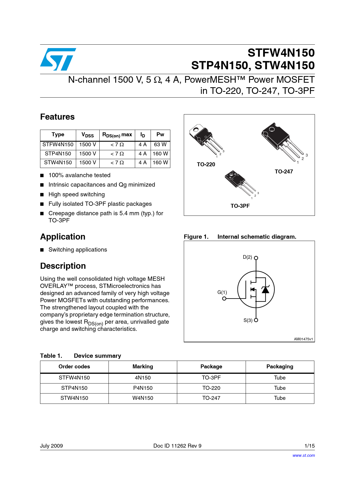 STFW4N150STP4N150, STW4N150 N-channel 1500 V, 5 Ω, 4 A, PowerMESH™ Power MOSFET in TO-220, TO-247, TO-3PF FeaturesTypeVDSS RDS(on) maxIDPw STFW4N150 1500 V < 7 Ω 4 A 63 W STP4N150 1500 V < 7 Ω 4 A 160 W 3 2 1 3 2 STW4N150 1500 V < 7 Ω 4 A 160 W TO-220 1 TO-247 ■ 100% avalanche tested ■ Intrinsic capacitances and Qg minimized ■ High speed switching 3 2 1 ■ Fully isolated TO-3PF plastic packages TO-3PF ■ Creepage distance path is 5.4 mm (typ.) for TO-3PF ApplicationFigure 1.Internal schematic diagram. ■ Switching applications $ Description Using the well consolidated high voltage MESH OVERLAY™ process, STMicroelectronics has designed an advanced family of very high voltage ' Power MOSFETs with outstanding performances. The strengthened layout coupled with the company’s proprietary edge termination structure, gives the lowest R 3 DS(on) per area, unrivalled gate charge and switching characteristics. !-V Table 1.Device summaryOrder codesMarkingPackagePackaging STFW4N150 4N150 TO-3PF Tube STP4N150 P4N150 TO-220 Tube STW4N150 W4N150 TO-247 Tube July 2009 Doc ID 11262 Rev 9 1/15 www.st.com 15 Document Outline Figure 1. Internal schematic diagram. Table 1. Device summary 1 Electrical ratings Table 2. Absolute maximum ratings Table 3. Thermal data Table 4. Avalanche characteristics 2 Electrical characteristics Table 5. On/off states Table 6. Dynamic Table 7. Source drain diode 2.1 Electrical characteristics (curves) Figure 2. Safe operating area for TO-220 Figure 3. Thermal impedance for TO-220 Figure 4. Safe operating area for TO-3PF Figure 5. Thermal impedance for TO-3PF Figure 6. Safe operating area for TO-247 Figure 7. Thermal impedance for TO-247 Figure 8. Output characteristics Figure 9. Transfer characteristics Figure 10. Transconductance Figure 11. Static drain-source on resistance Figure 12. Gate charge vs gate-source voltage Figure 13. Capacitance variations Figure 14. Normalized gate threshold voltage vs temperature Figure 15. Normalized on resistance vs temperature Figure 16. Source-drain diode forward characteristics Figure 17. Normalized BVDSS vs temperature Figure 18. Maximum avalanche energy vs temperature 3 Test circuits Figure 19. Switching times test circuit for resistive load Figure 20. Gate charge test circuit Figure 21. Test circuit for inductive load switching and diode recovery times Figure 22. Unclamped inductive load test circuit Figure 23. Unclamped inductive waveform Figure 24. Switching time waveform 4 Package mechanical data 5 Revision history Table 8. Document revision history