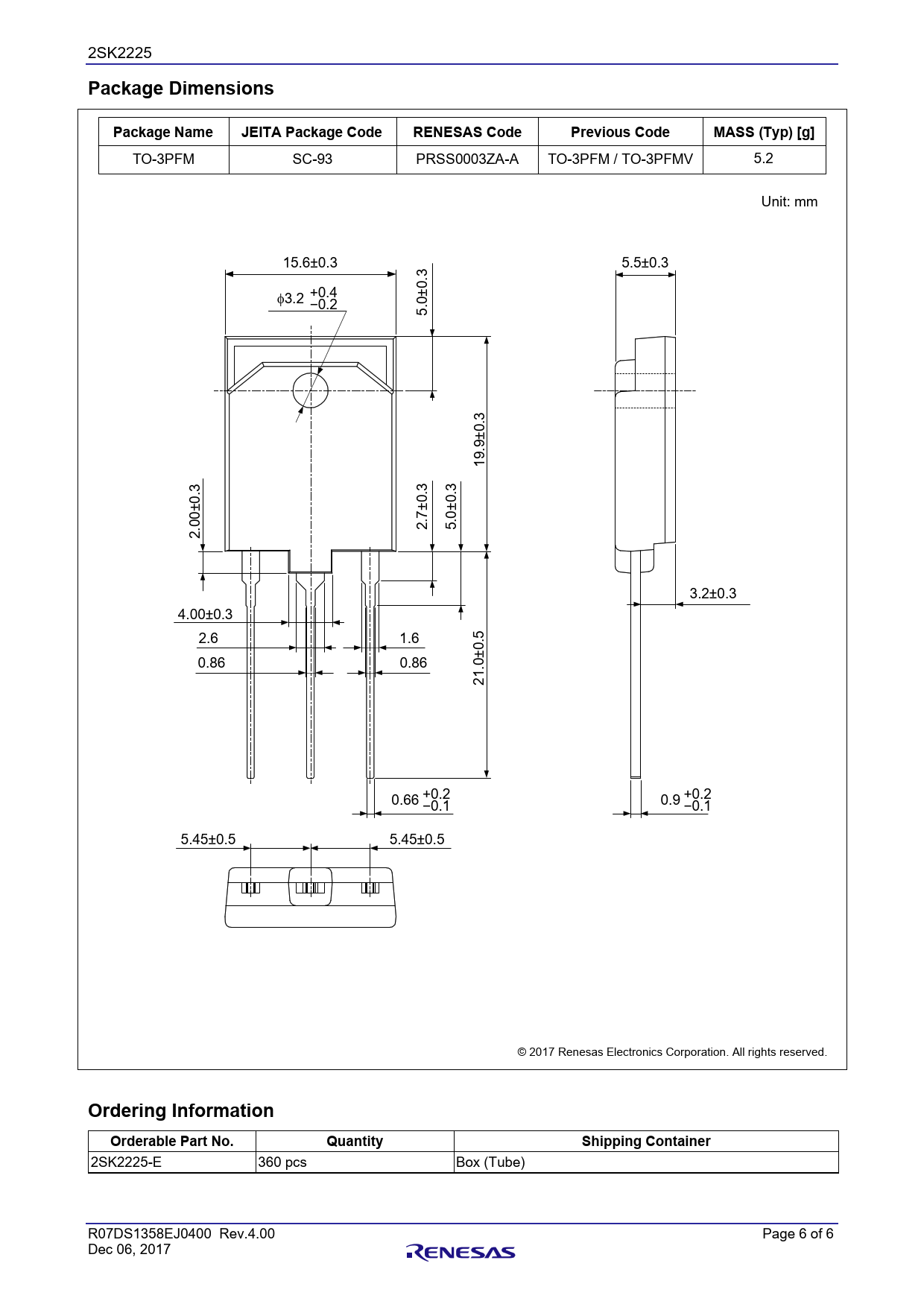 2SK2225-E 360 pcs Box (Tube) R07DS1358EJ0400 Rev.4.00 Page 6 of 6 Dec 06, 2017