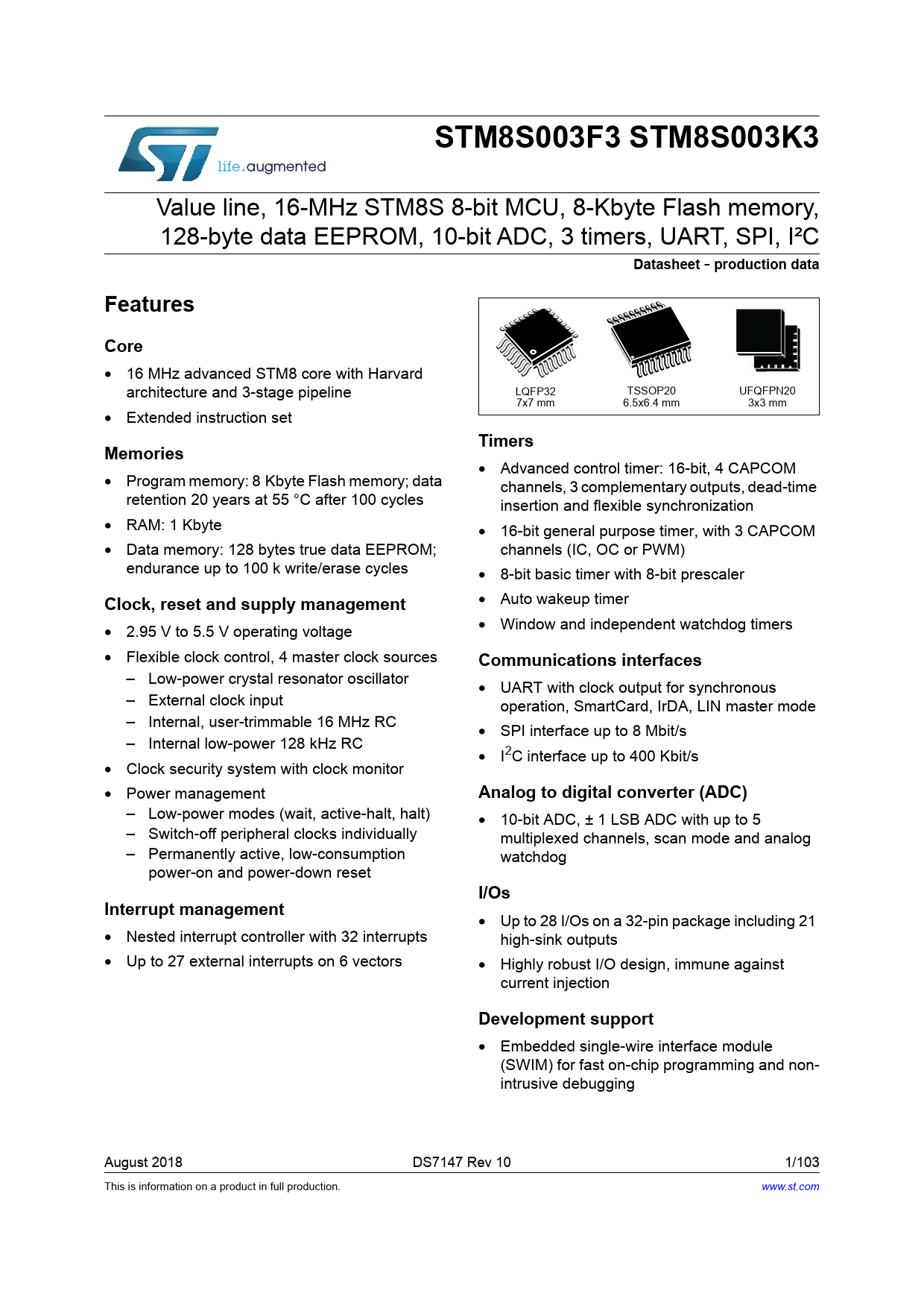 | Pages / Page | 103 / 1 — STM8S003F3 STM8S003K3. Datasheet. production data. Features. Core. … |