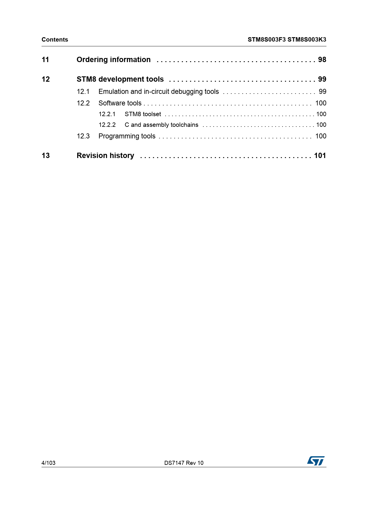 Contents. STM8S003F3 STM8S003K3. Ordering information . 98. STM8 development tools . 99. Revision history . 101