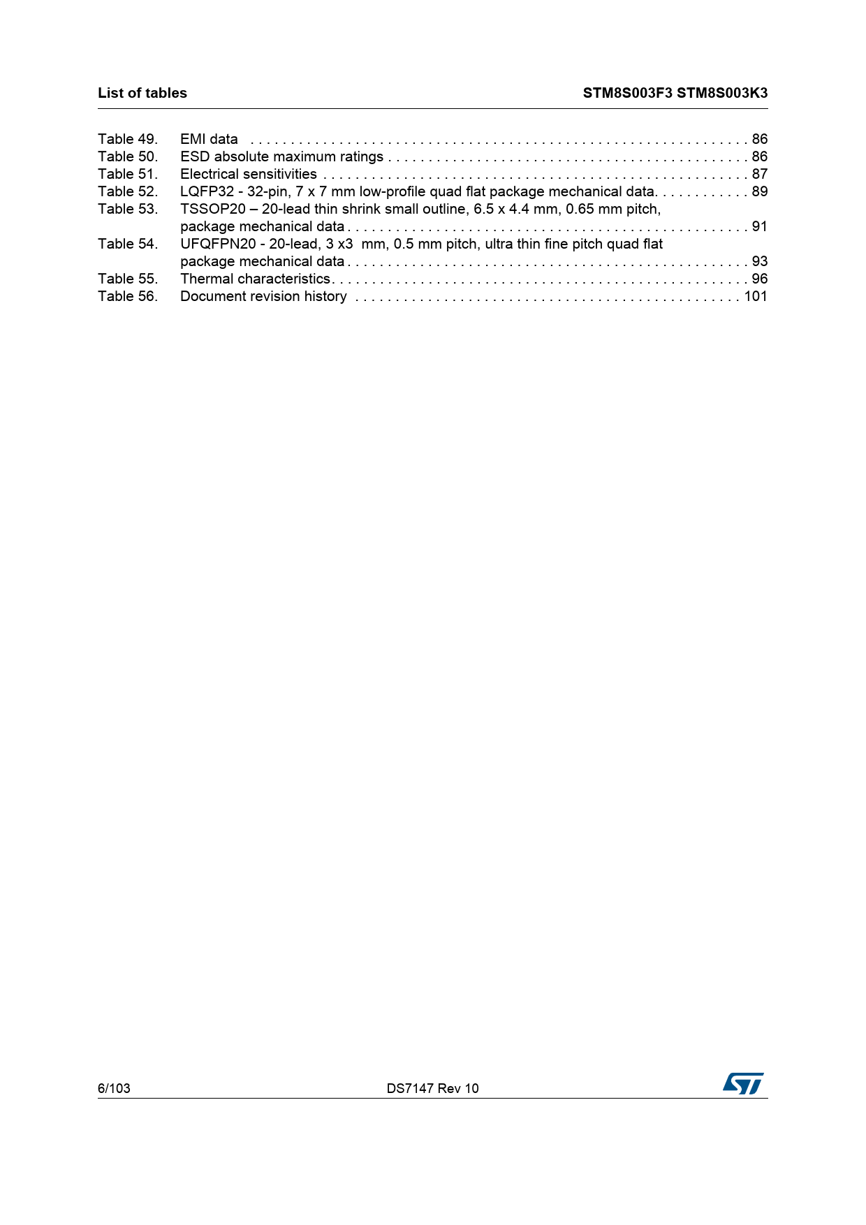 | Pages / Page | 103 / 6 — List of tables. STM8S003F3 STM8S003K3 |