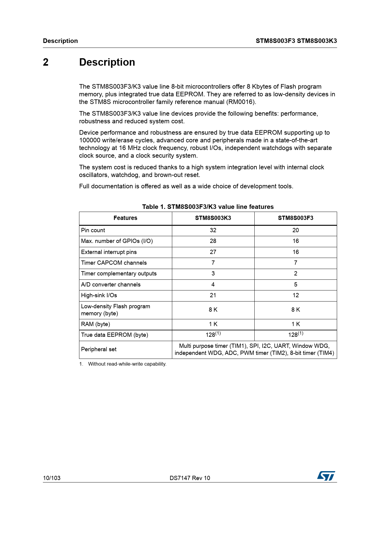 | Pages / Page | 103 / 10 — Description. STM8S003F3 STM8S003K3. 2 Description. Table 1. STM8S003F3/K3 … |