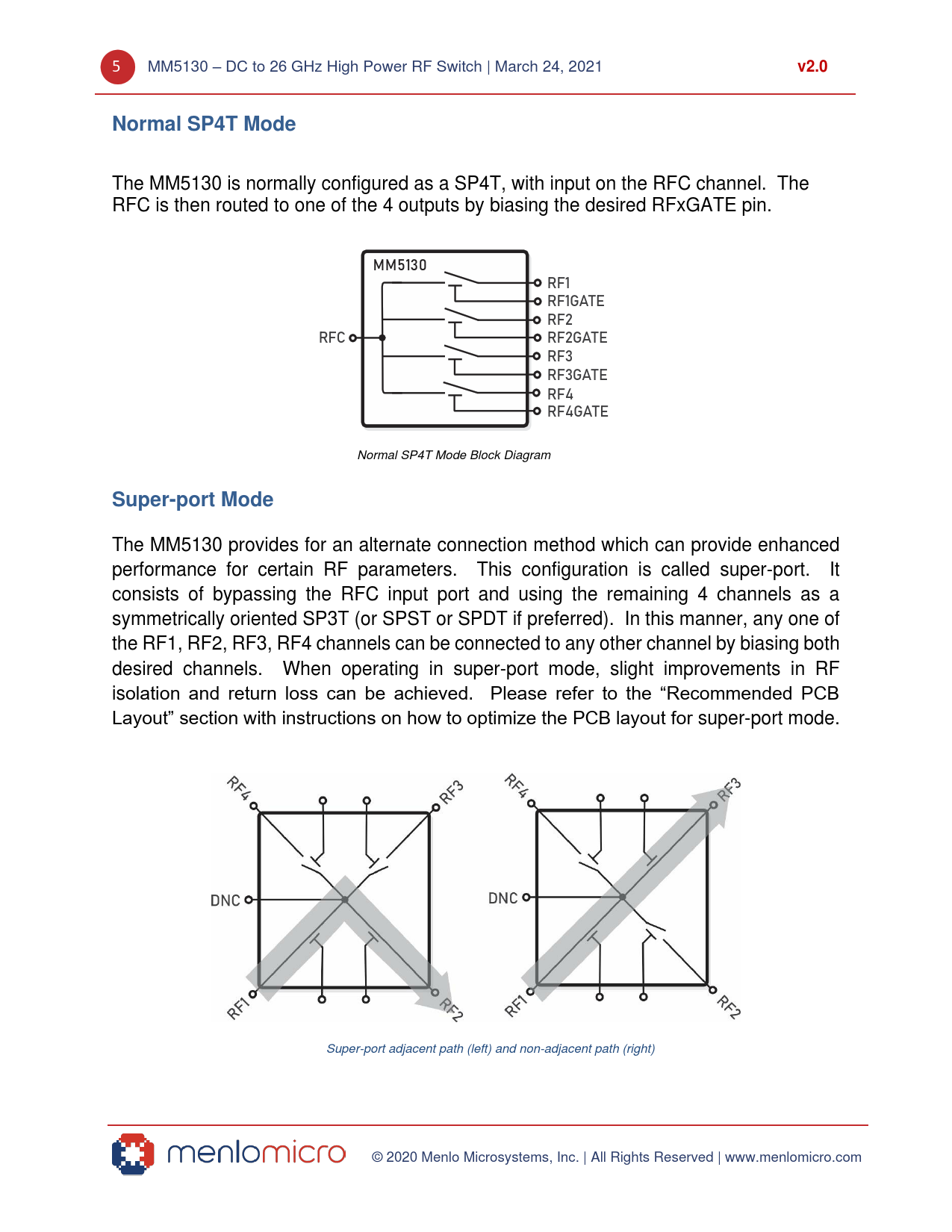 The MM5130 provides for an alternate connection method which can provide enhanced performance for certain RF parameters. This configuration is called super-port. It consists of bypassing the RFC input port and using the remaining 4 channels as a symmetrically oriented SP3T (or SPST or SPDT if preferred). In this manner, any one of the RF1, RF2, RF3, RF4 channels can be connected to any other channel by biasing both desired channels. When operating in super-port mode, slight improvements in RF isolation and return loss can be achieved. Please refer to the “Recommended PCB Layout” section with instructions on how to optimize the PCB layout for super-port mode. Super-port adjacent path (left) and non-adjacent path (right) © 2020 Menlo Microsystems, Inc. | All Rights Reserved | www.menlomicro.com