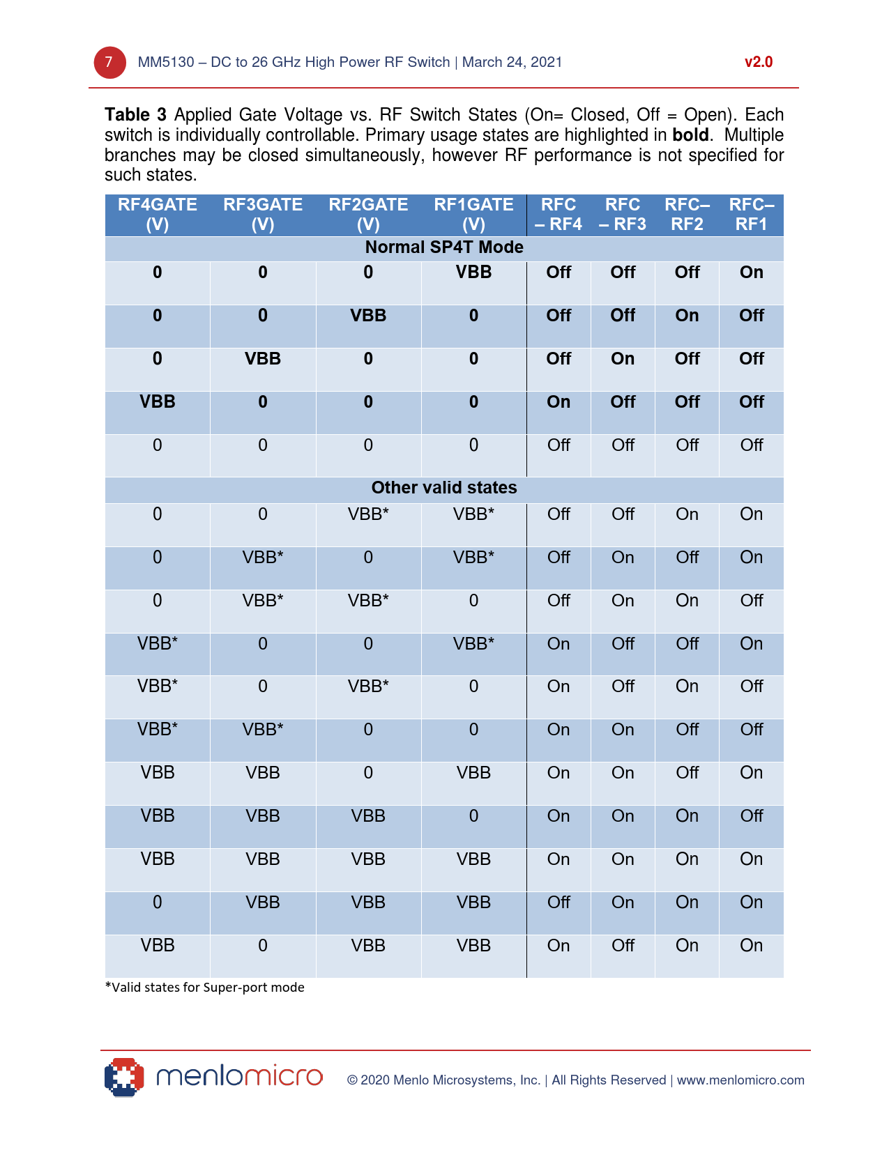 v2.0. Table 3. bold. RF4GATE. RF3GATE. RF2GATE. RF1GATE. RFC. RFC RFC– RFC–. (V). – RF4 – RF3 RF2. RF1. Normal SP4T Mode. VBB. Off
