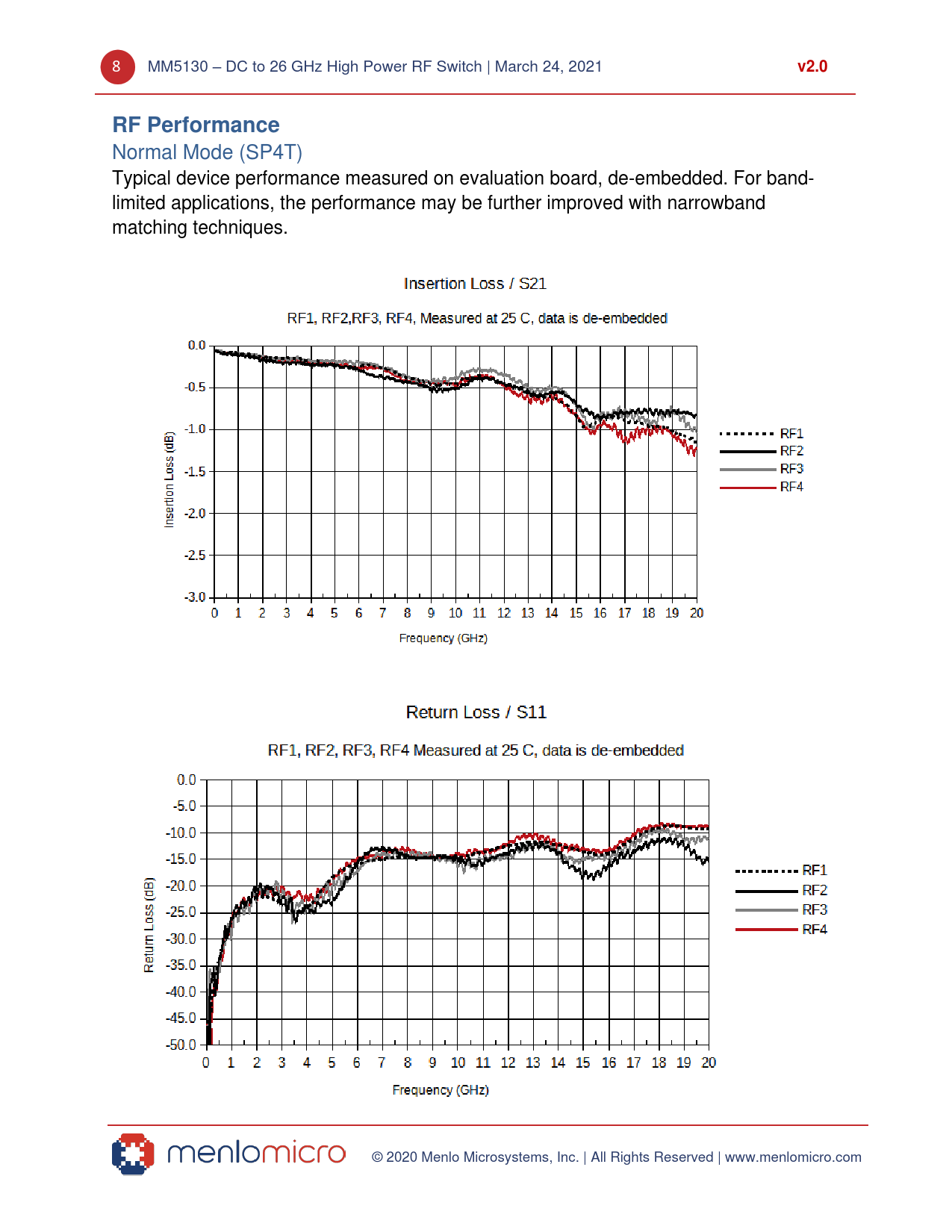 Normal Mode (SP4T) Typical device performance measured on evaluation board, de-embedded. For band- limited applications, the performance may be further improved with narrowband matching techniques. © 2020 Menlo Microsystems, Inc. | All Rights Reserved | www.menlomicro.com