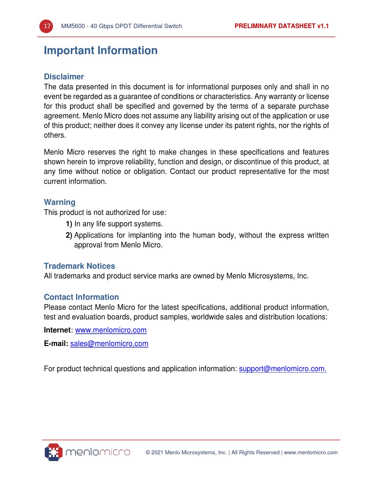 The data presented in this document is for informational purposes only and shall in no event be regarded as a guarantee of conditions or characteristics. Any warranty or license for this product shall be specified and governed by the terms of a separate purchase agreement. Menlo Micro does not assume any liability arising out of the application or use of this product; neither does it convey any license under its patent rights, nor the rights of others. Menlo Micro reserves the right to make changes in these specifications and features shown herein to improve reliability, function and design, or discontinue of this product, at any time without notice or obligation. Contact our product representative for the most current information.