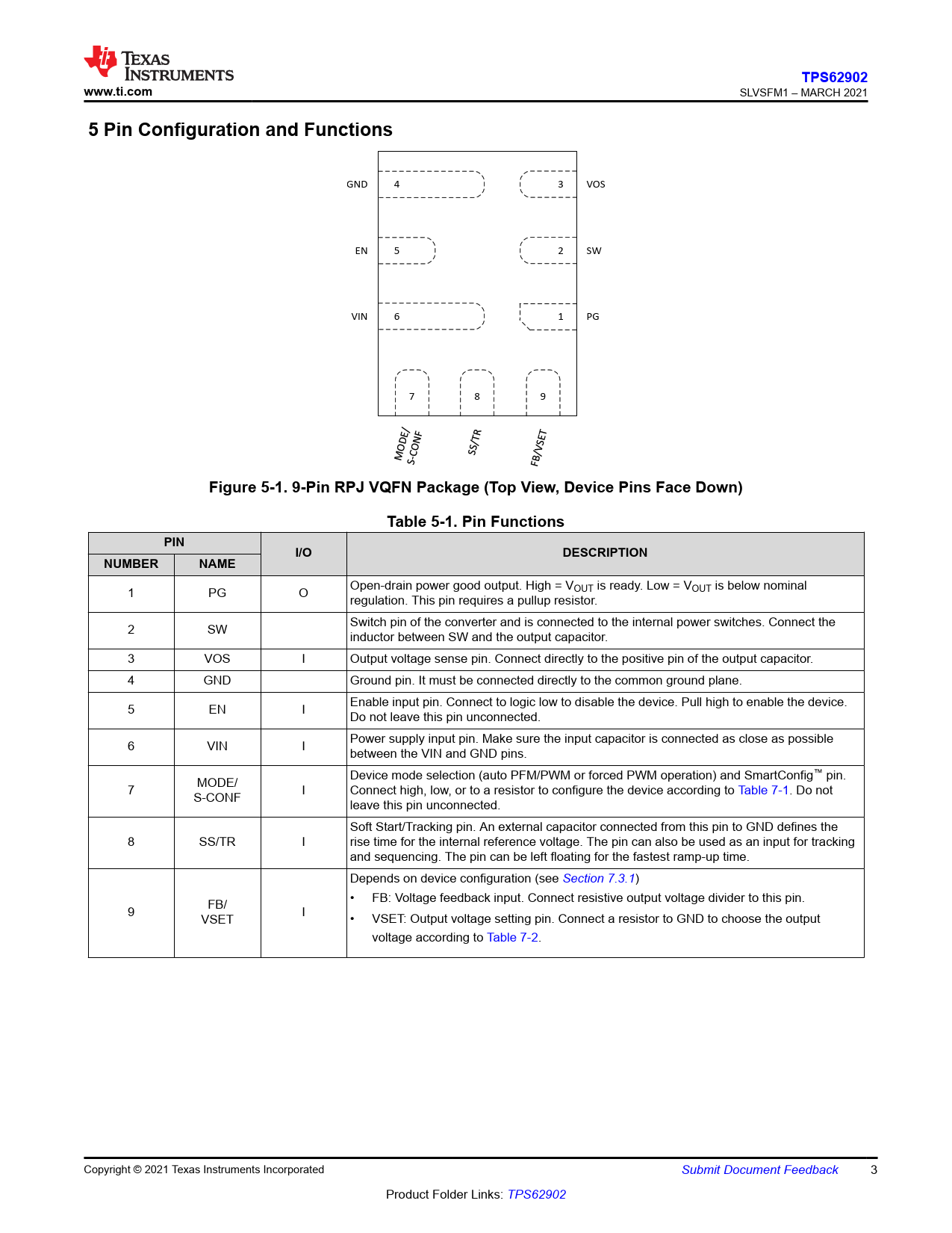 TPS62902. www.ti.com. 5 Pin Configuration and Functions. Figure 5-1. 9-Pin RPJ VQFN Package (Top View, Device Pins Face Down)